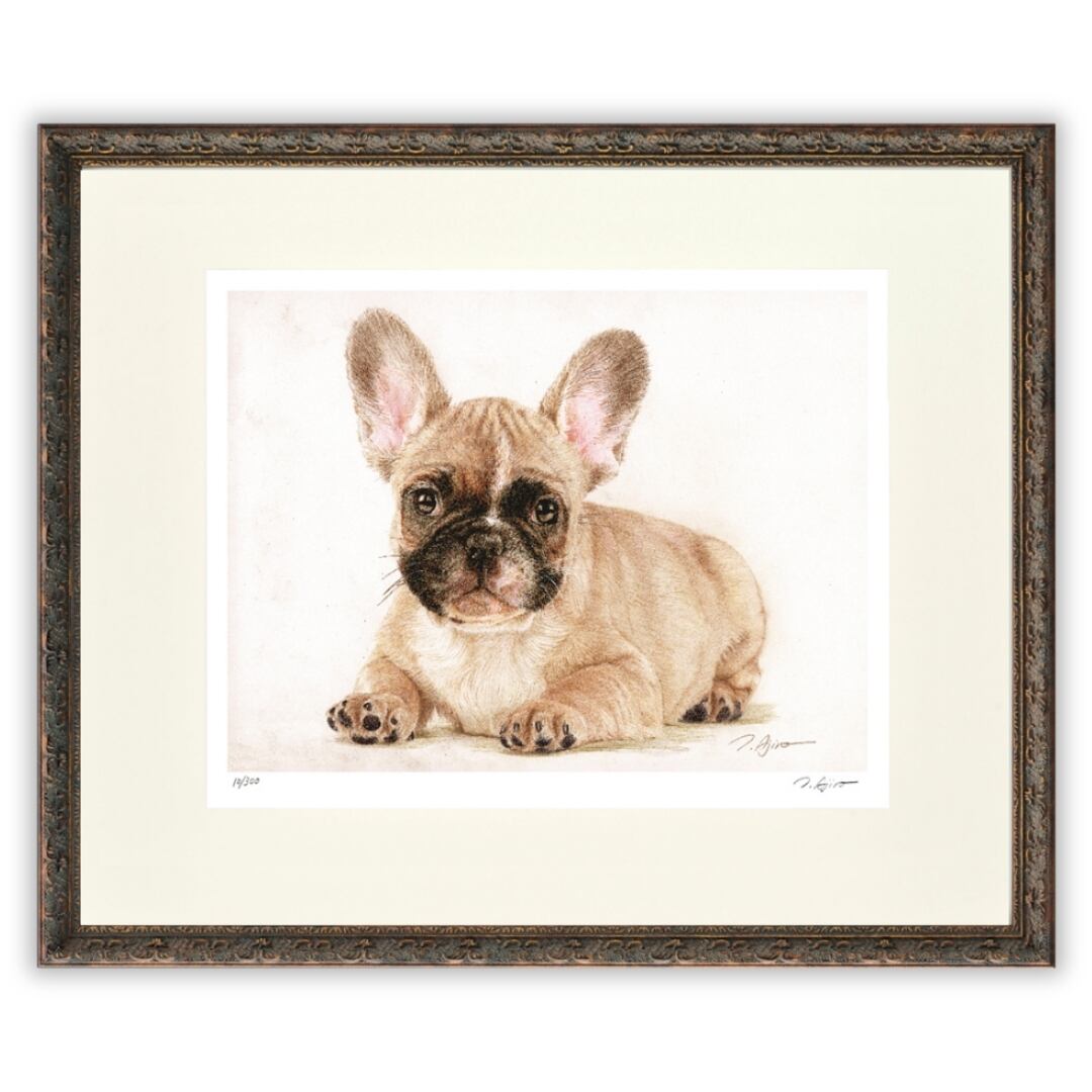 鉛筆画の繊細なタッチで描かれたフレンチブルドッグの表情が、見る人の心を優しく包み込むインテリアアート。柔らかい毛並みの質感や、あどけない瞳の輝きまで丁寧に描写され、その可愛らしさがリアルに伝わってきます。イラストでありながら、写真以上に命の温もりを感じさせるのは、鉛筆画ならではの陰影の美しさと緻密な筆致のなせる技。無垢でまっすぐなまなざしは、見る人の心に癒しと安らぎをもたらす、愛らしさと芸術性が共存するアート作品です。