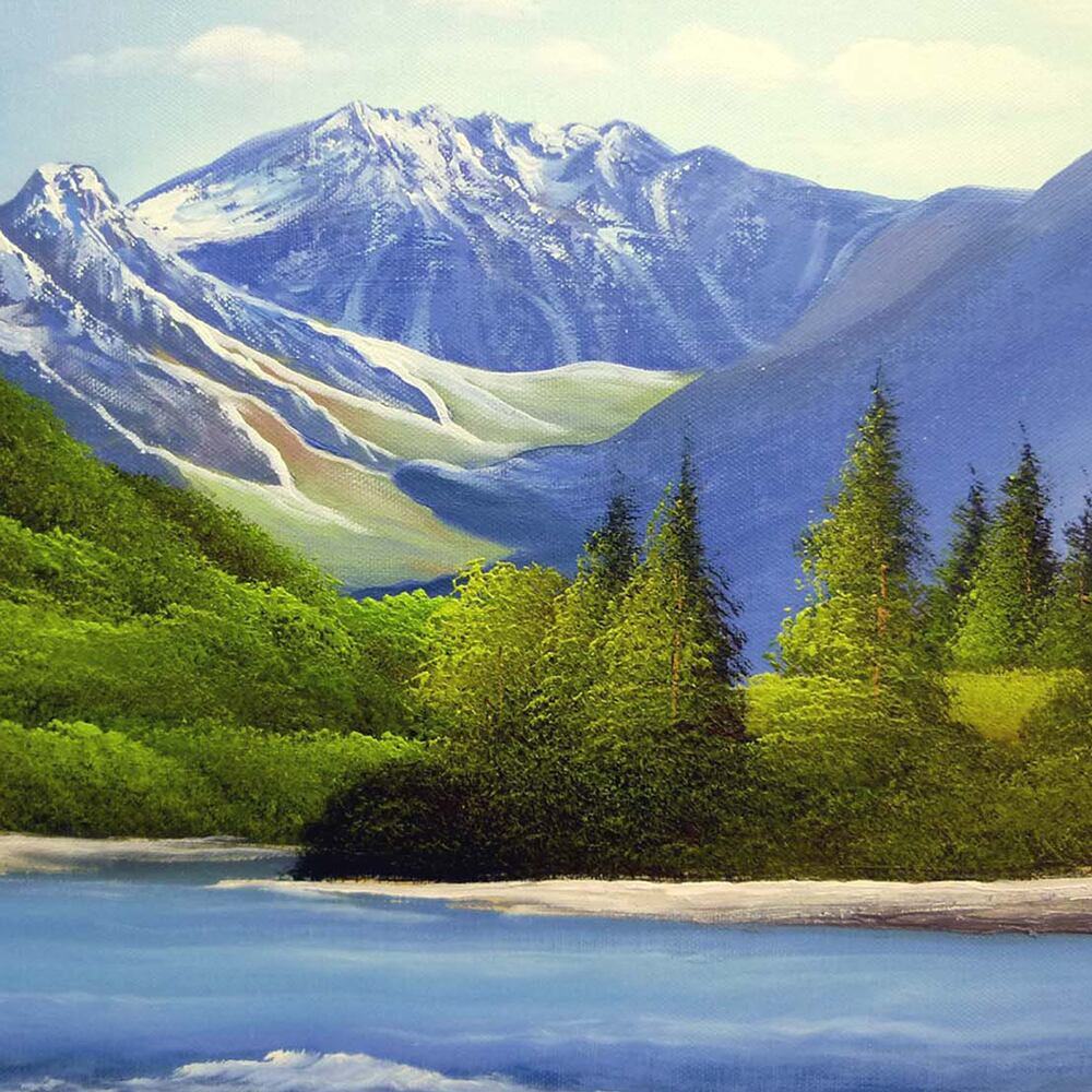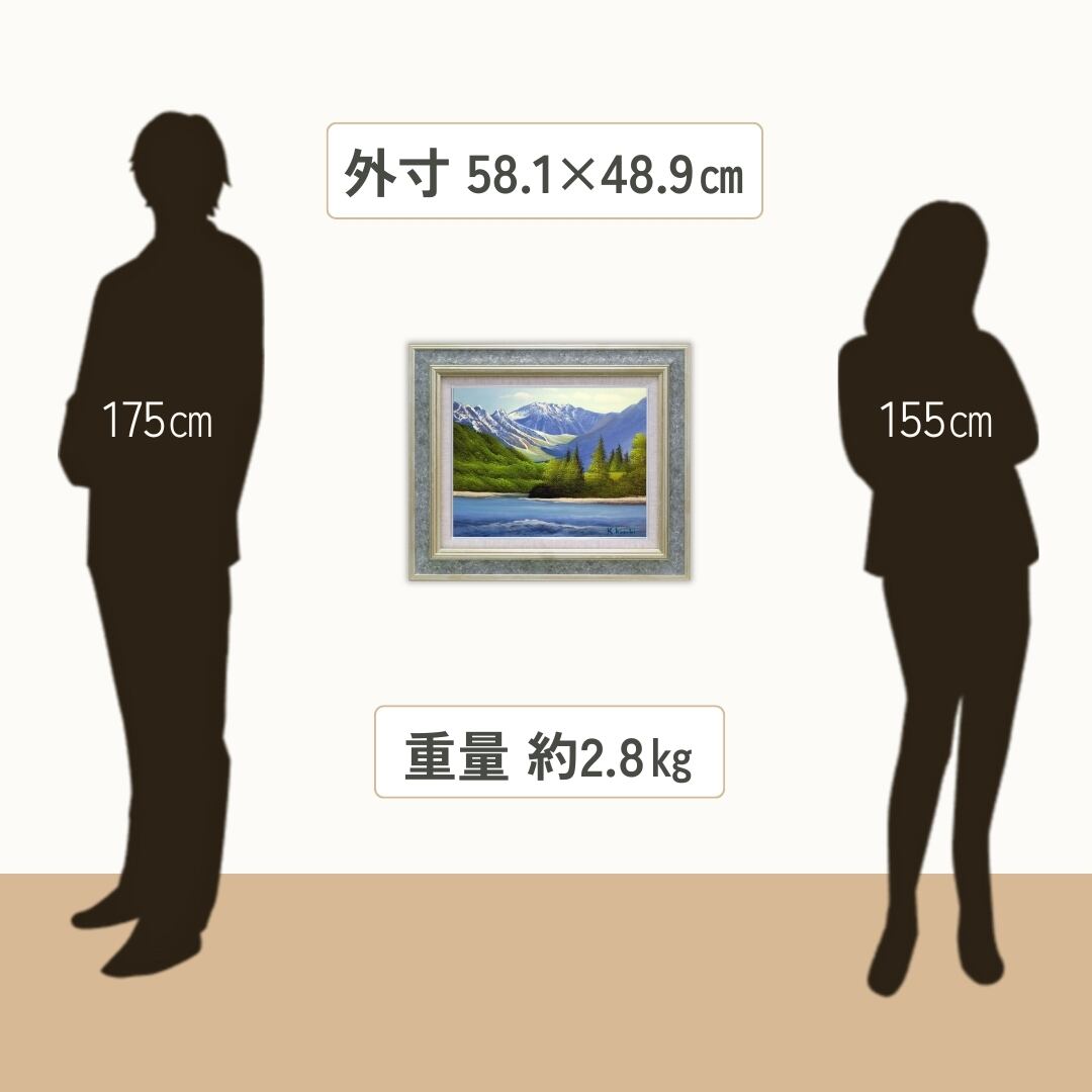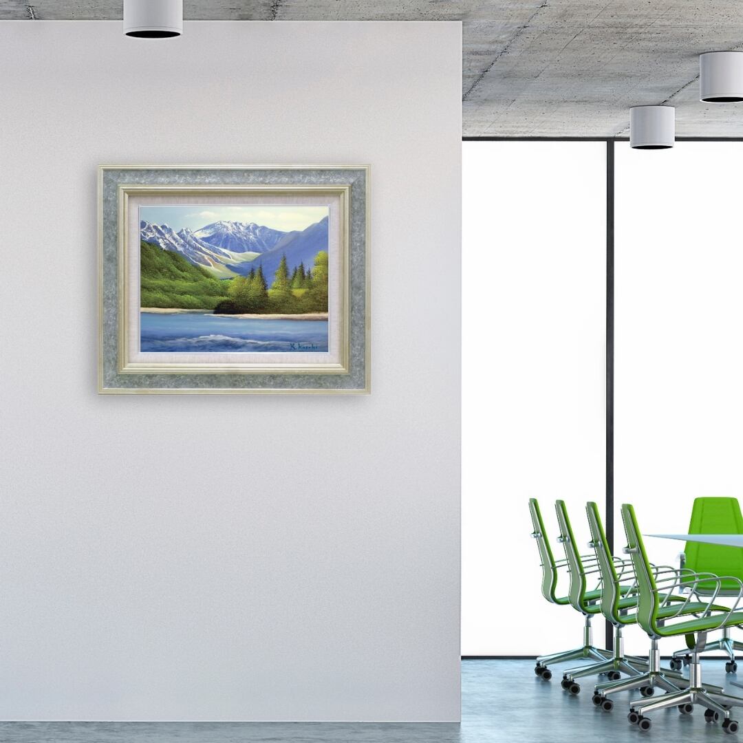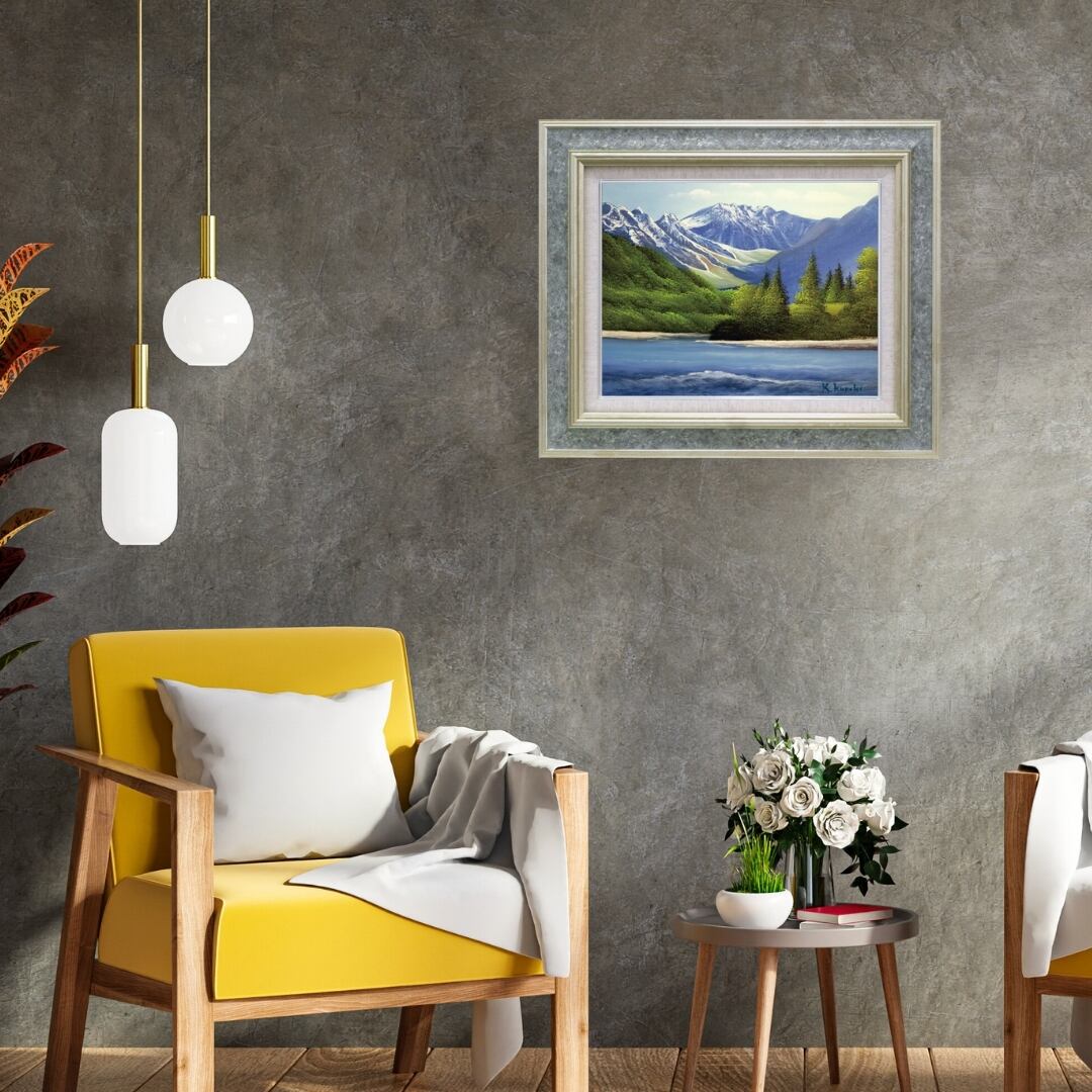 雄大な北アルプスの山並みと澄みわたる清流を描いたインテリアアートです。雪を抱く峰々の迫力と、緑豊かな森の静けさが見事に対比され、自然の壮大さと安らぎが同居しています。油絵ならではの筆致と絵具の厚みが、山肌の立体感や水面のきらめきを巧みに表現し、見る角度や光によって異なる深みを感じさせます。爽やかなブルーとやわらかなグリーンのグラデーションが心地よく調和し、まるで清流の音が聞こえてくるかのような臨場感。自然の美しさをリアルに伝える、格調高いアート作品です。