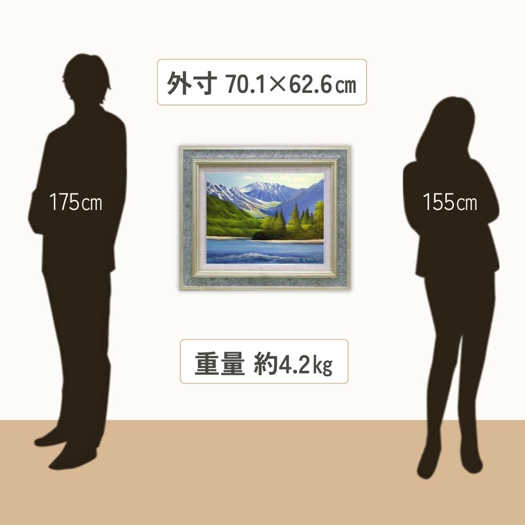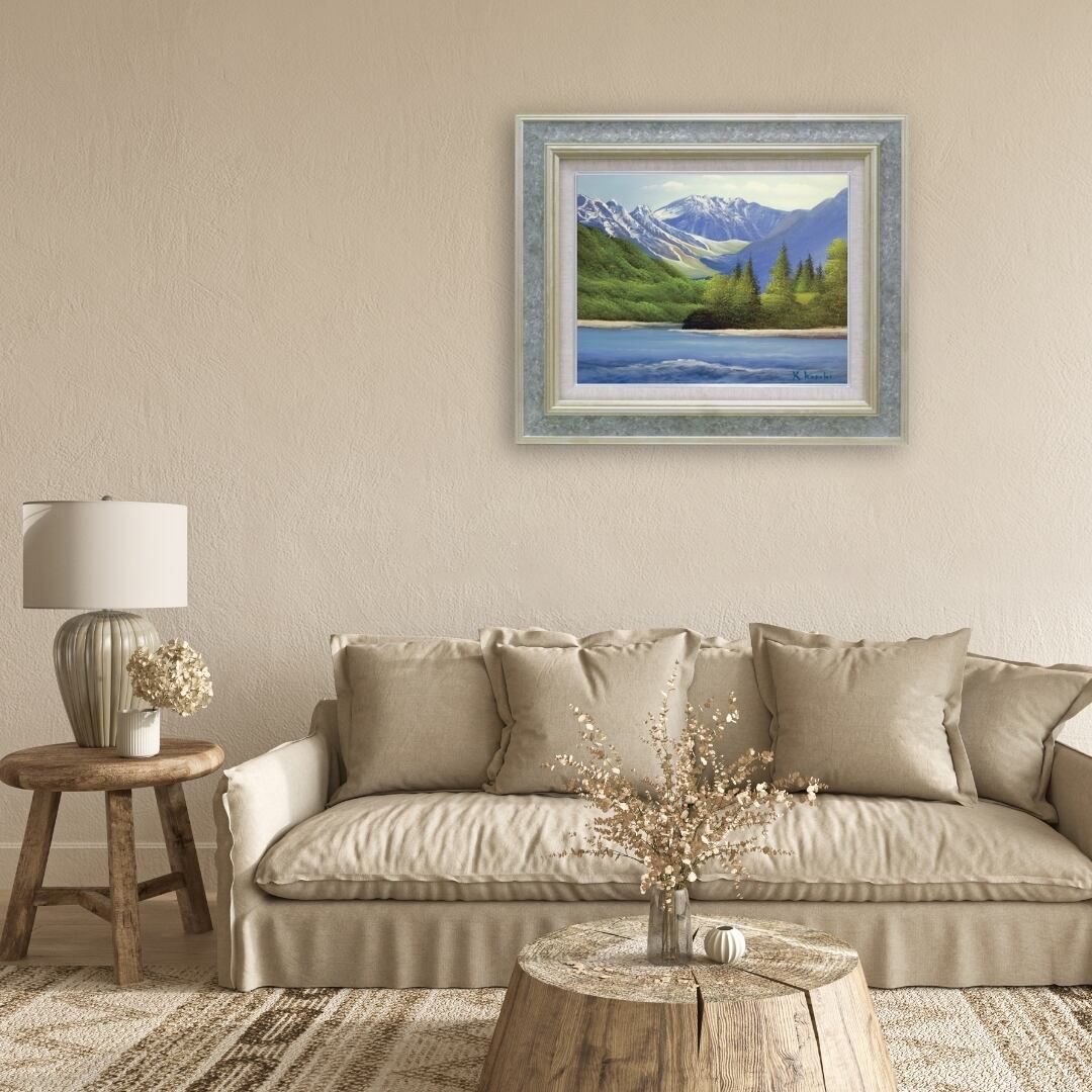 雄大な北アルプスの山並みと澄みわたる清流を描いたインテリアアートです。雪を抱く峰々の迫力と、緑豊かな森の静けさが見事に対比され、自然の壮大さと安らぎが同居しています。油絵ならではの筆致と絵具の厚みが、山肌の立体感や水面のきらめきを巧みに表現し、見る角度や光によって異なる深みを感じさせます。爽やかなブルーとやわらかなグリーンのグラデーションが心地よく調和し、まるで清流の音が聞こえてくるかのような臨場感。自然の美しさをリアルに伝える、格調高いアート作品です。