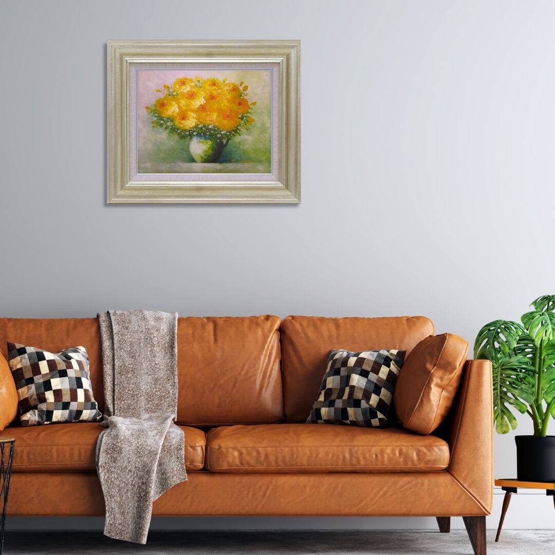 鮮やかな黄色の花々が咲き誇る花瓶を描いたインテリアアートです。温かみのある色彩と柔らかな光の表現が、見る人の心を明るく包み込みます。油絵ならではの厚みのある絵具の重なりが花びら一枚一枚の立体感を際立たせ、まるで香りまで伝わってくるような生命力を感じさせます。背景の淡いグリーンやクリーム色が、花の輝きを引き立てながら優しい空気感を演出。幸福感と安らぎをもたらすイラストとして、飾るだけで空間に華やぎを添えるアート作品です。