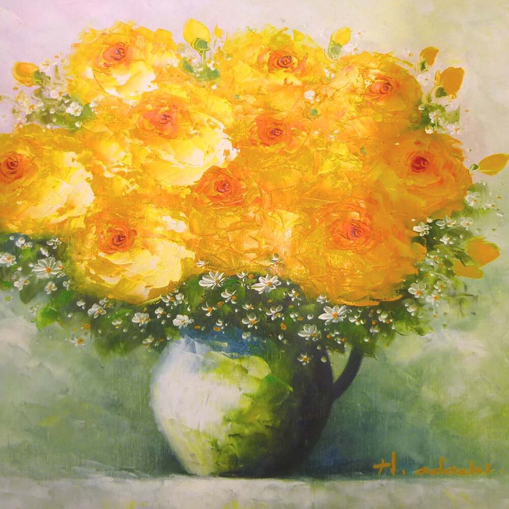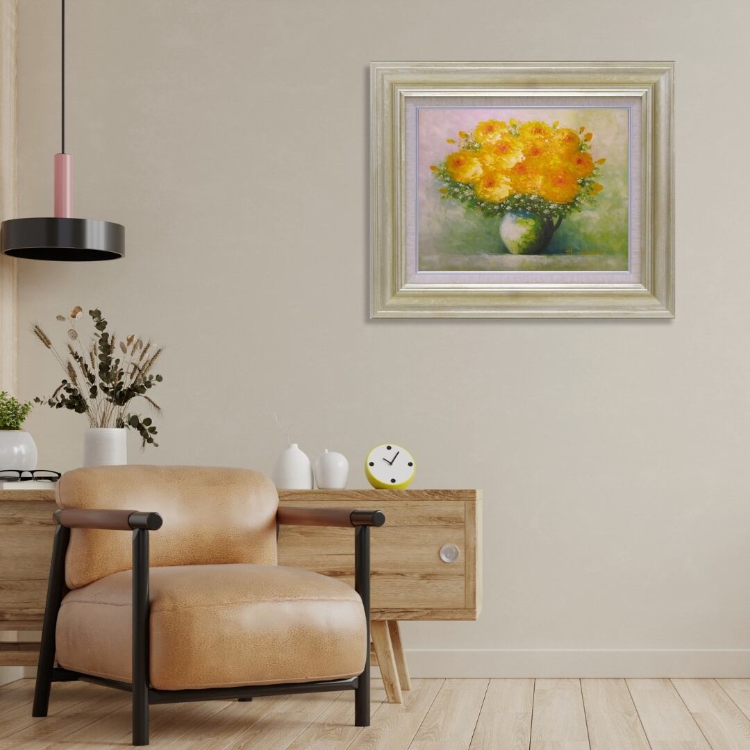 鮮やかな黄色の花々が咲き誇る花瓶を描いたインテリアアートです。温かみのある色彩と柔らかな光の表現が、見る人の心を明るく包み込みます。油絵ならではの厚みのある絵具の重なりが花びら一枚一枚の立体感を際立たせ、まるで香りまで伝わってくるような生命力を感じさせます。背景の淡いグリーンやクリーム色が、花の輝きを引き立てながら優しい空気感を演出。幸福感と安らぎをもたらすイラストとして、飾るだけで空間に華やぎを添えるアート作品です。