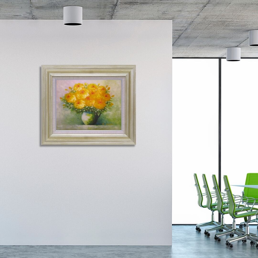 この額縁付きのインテリアアートは、リビングに明るさと温もりを与え、毎日の暮らしに優しい彩りを添えます。鮮やかな黄色の花が空間全体を明るくし、見るたびに前向きな気持ちにさせてくれます。また、店舗に飾れば、お客様を明るく迎える華やかなアクセントとして印象を高め、温かな雰囲気を演出します。自然の美しさと絵具のぬくもりが調和したこのアートは、癒しと幸福感を同時に感じさせる存在。額縁付きなので、届いてすぐに上質なインテリアアートとしてお楽しみいただけます。