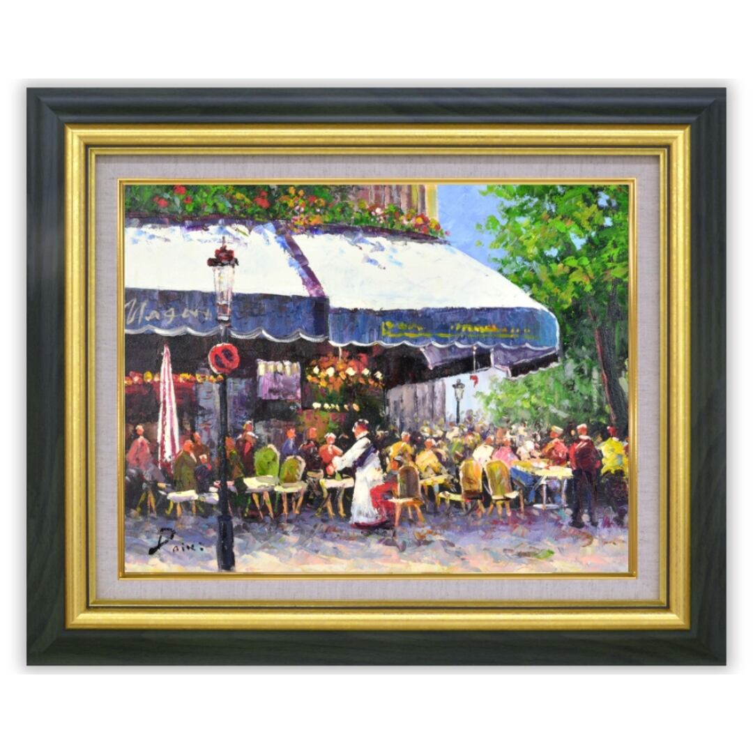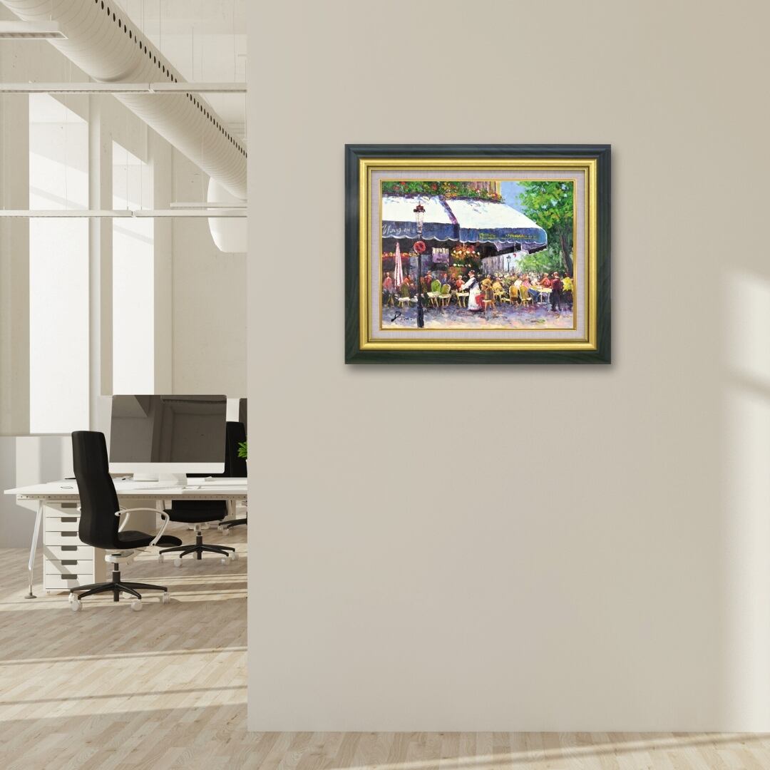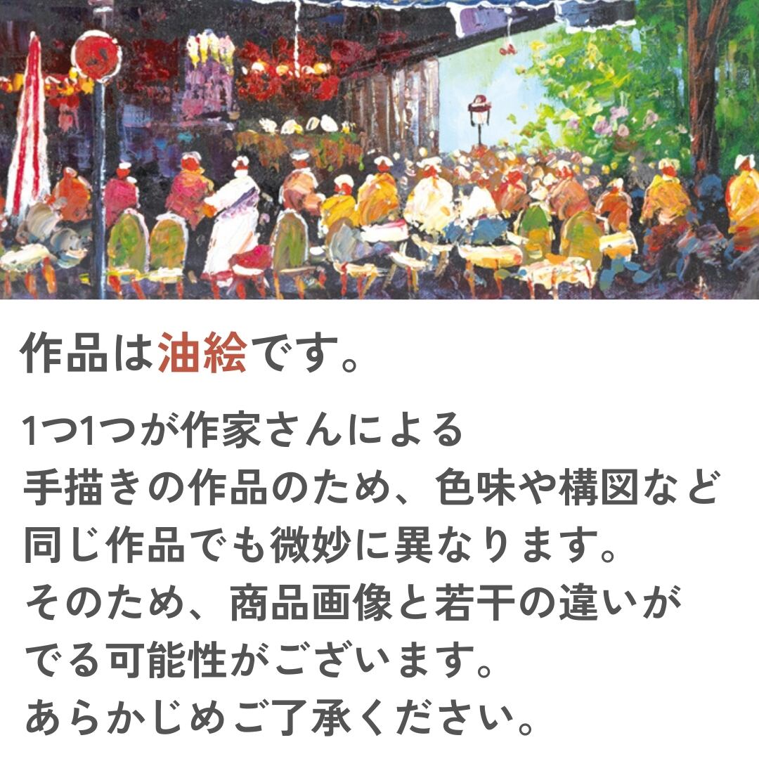 ヨーロッパの街角に佇むカフェを描いたインテリアアートです。陽光が差し込むテラス席には、人々の談笑と心地よい時間が流れ、まるでその場の空気まで伝わってくるような温かさを感じます。油絵ならではの厚みのあるタッチと豊かな色彩が、テーブルクロスや花々、光を受けた建物の質感を生き生きと表現。鮮やかなブルーのオーニングと、緑の木々、華やかな人々の姿が調和し、見ているだけで心が弾むようなアート作品です。旅先の思い出を閉じ込めたような、情緒と活気に満ちたイラストです。