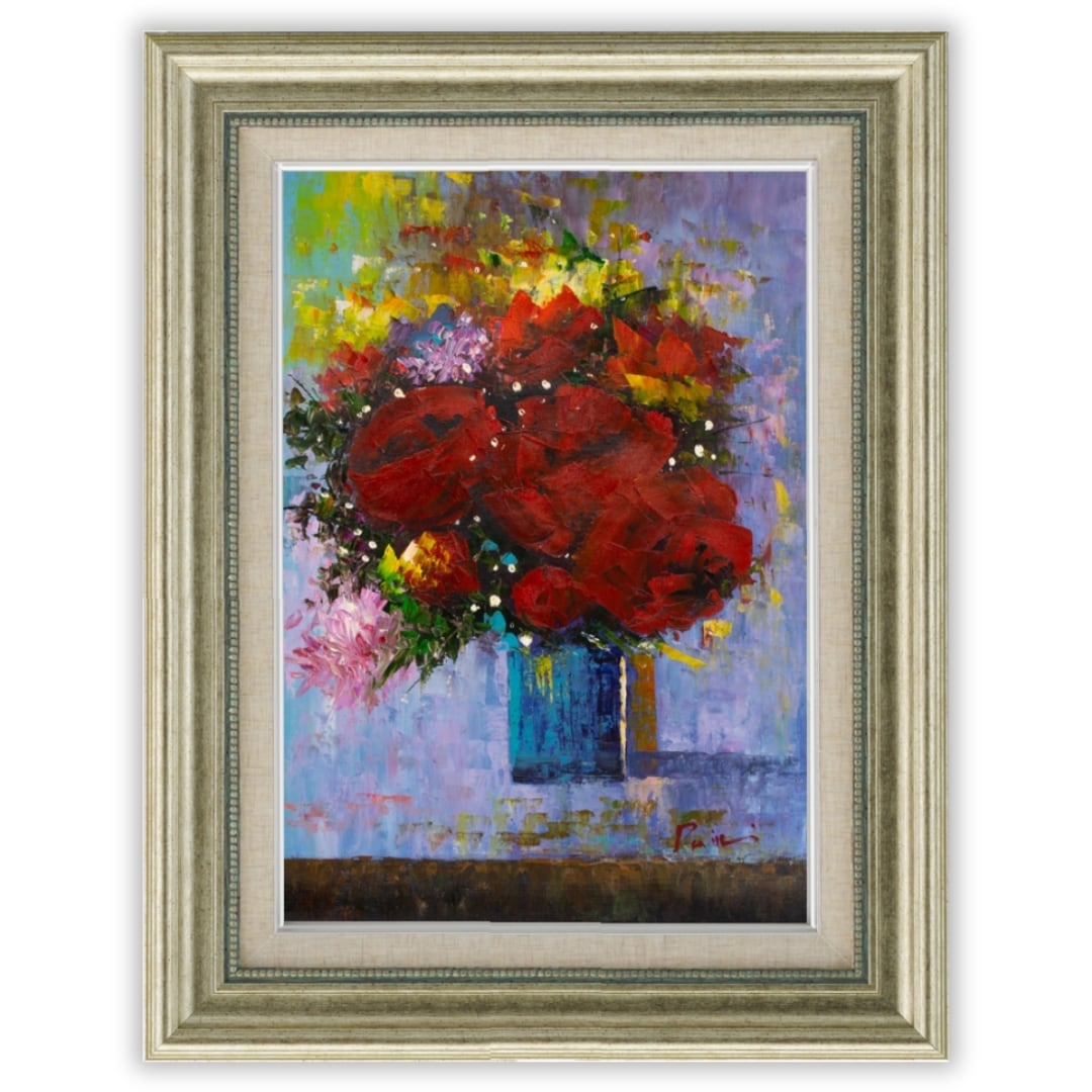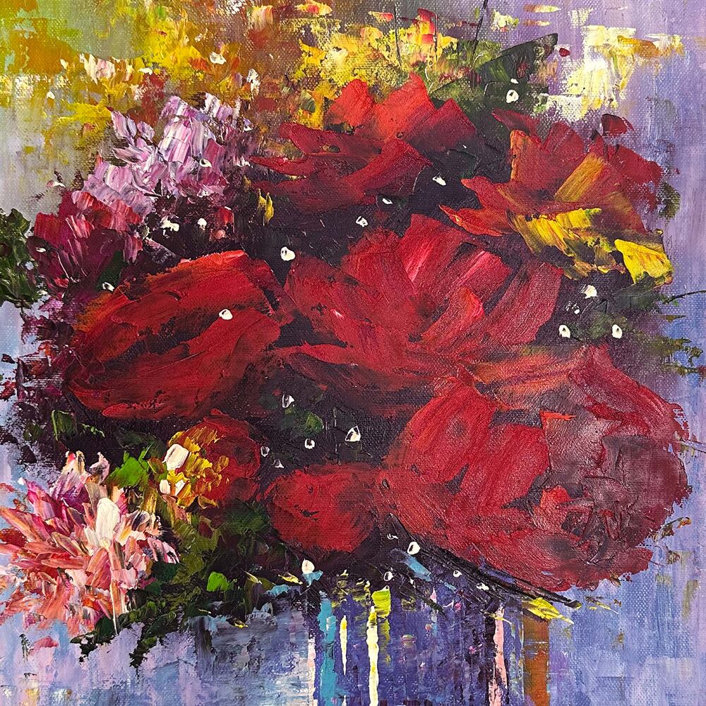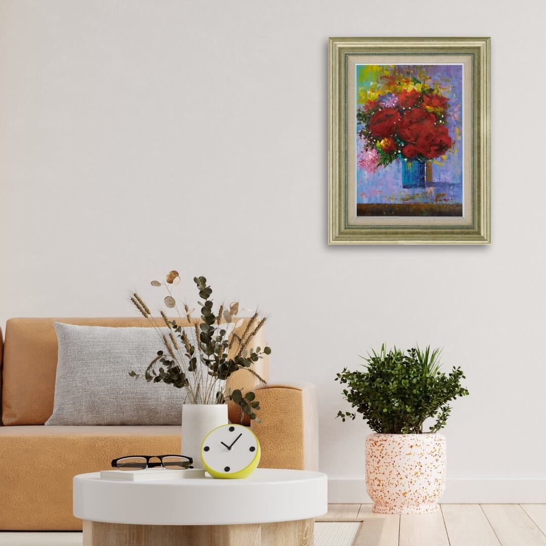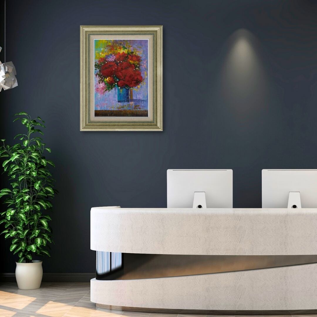 深みのある赤薔薇が大胆に描かれたインテリアアートです。濃淡のある赤が生み出す奥行きと、油絵ならではの厚みのある筆致が花の力強さを際立たせています。背景にはブルーやイエローの柔らかな色彩が重なり、情熱と穏やかさが共存する絶妙なバランスを感じさせます。光を受けるたびに異なる表情を見せる油絵具の質感が、まるで生花のような瑞々しさを表現。花瓶に生けられた薔薇の美しさが空間を華やかに彩る、上質で印象的なアート作品です。感性豊かな筆づかいが魅力のイラストです。