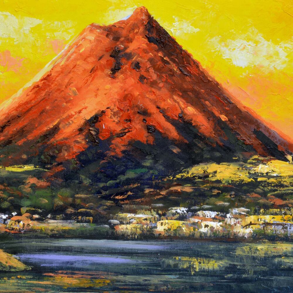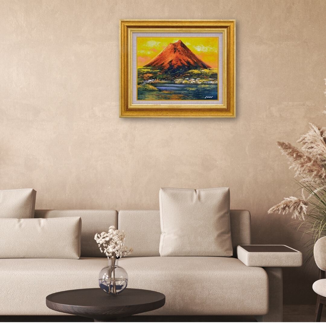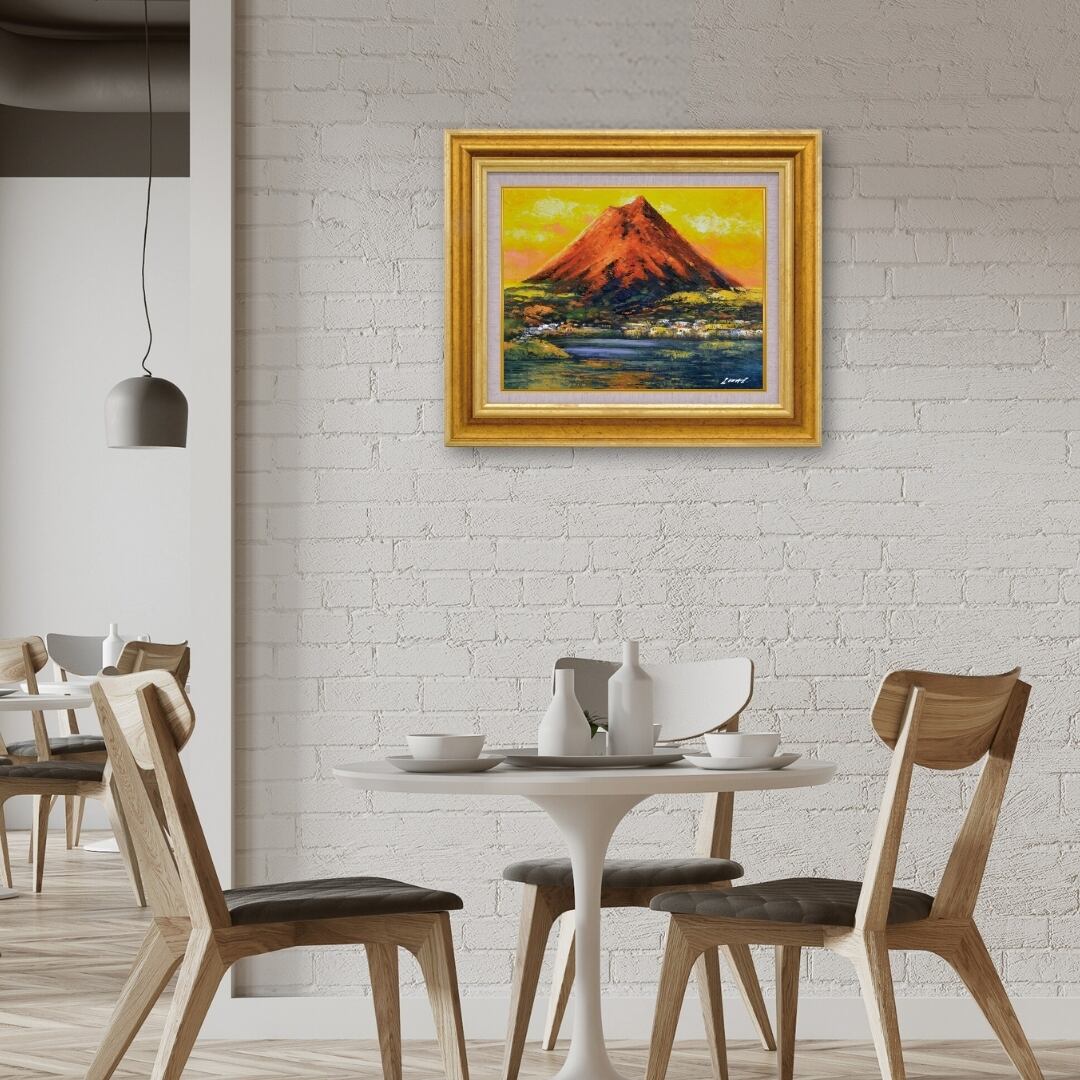朝陽に染まる富士の雄姿を描いたインテリアアートです。黄金色の空に映える赤富士が、圧倒的な存在感を放ちながらも、どこか神聖で穏やかな印象を与えます。油絵具を重ねた厚みのある筆致が、山肌の力強さと光の移ろいを巧みに表現。画面全体に広がる赤と黄のコントラストが、自然の息吹と神々しさを感じさせます。水面に映る富士の姿が静けさを添え、観る人の心に深い感動を呼び起こすアート作品です。日本の象徴を描いた格調高いイラストとして、存在感ある一枚に仕上がっています。