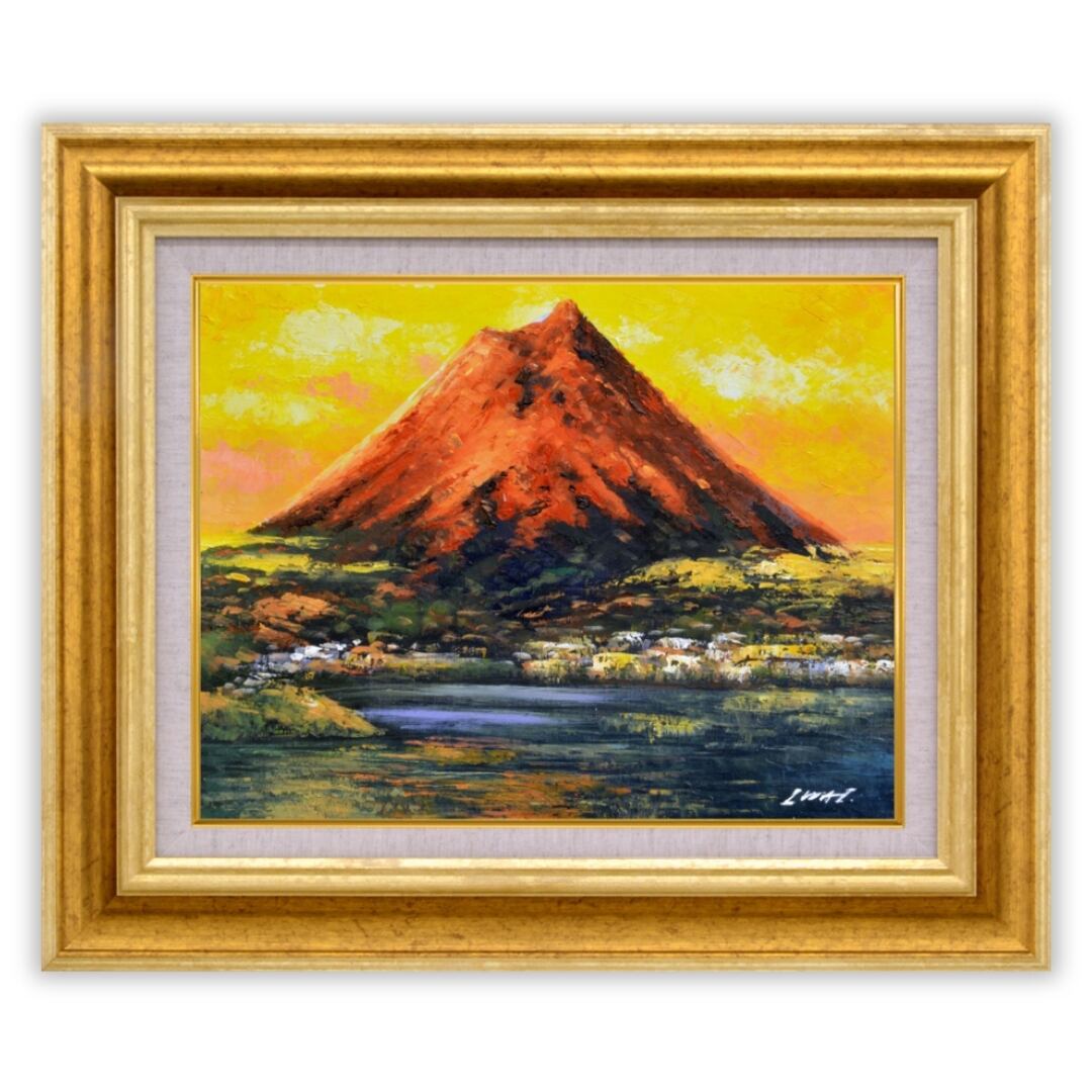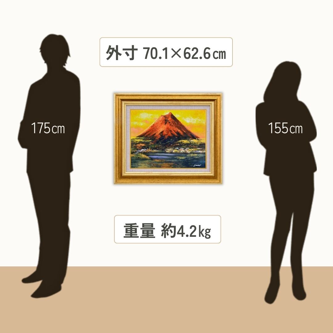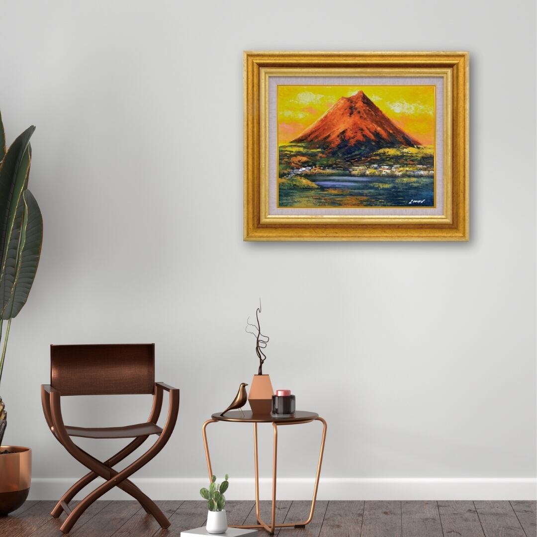 朝陽に染まる富士の雄姿を描いたインテリアアートです。黄金色の空に映える赤富士が、圧倒的な存在感を放ちながらも、どこか神聖で穏やかな印象を与えます。油絵具を重ねた厚みのある筆致が、山肌の力強さと光の移ろいを巧みに表現。画面全体に広がる赤と黄のコントラストが、自然の息吹と神々しさを感じさせます。水面に映る富士の姿が静けさを添え、観る人の心に深い感動を呼び起こすアート作品です。日本の象徴を描いた格調高いイラストとして、存在感ある一枚に仕上がっています。