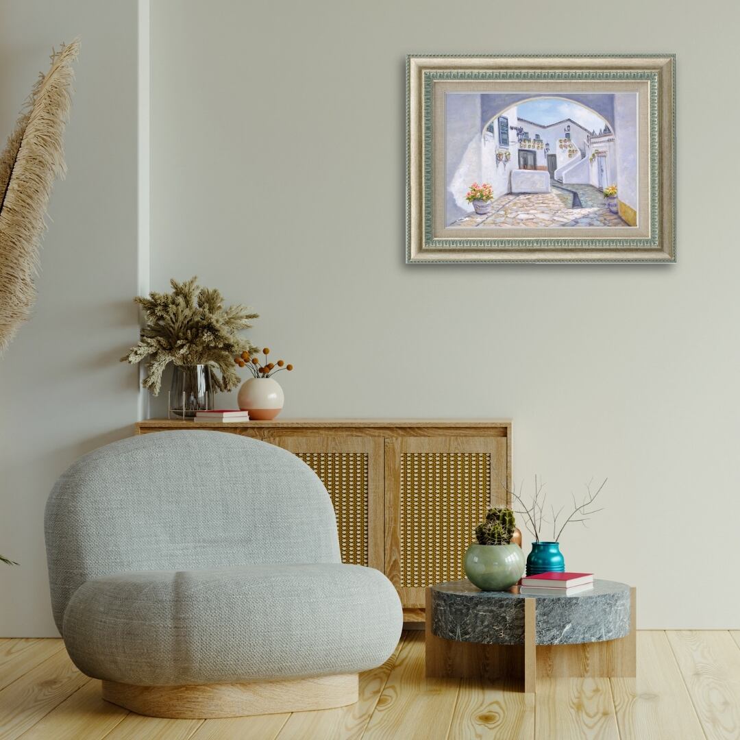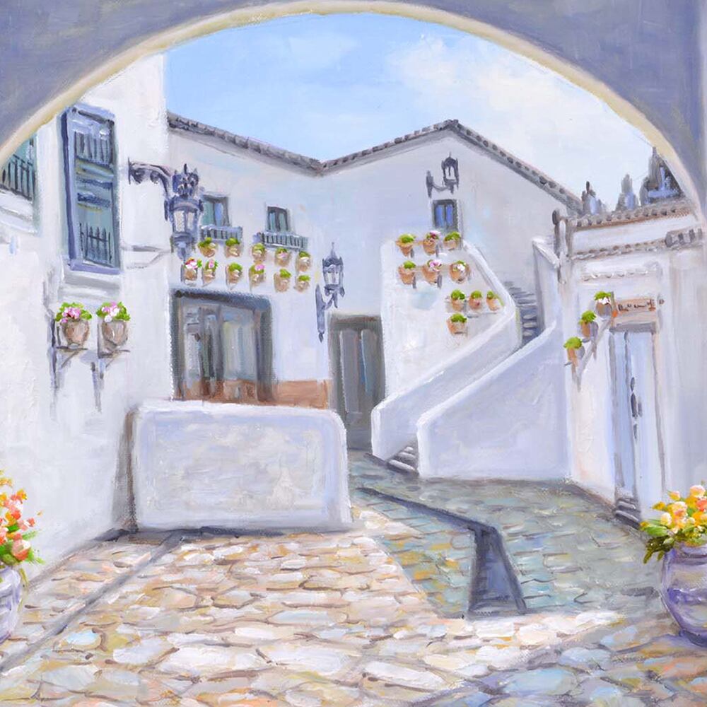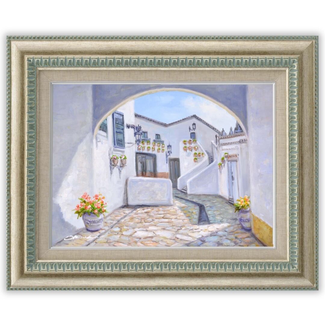 白壁の建物が立ち並ぶ石畳の小路を描いた、明るく爽やかな印象のインテリアアートです。柔らかな日差しを浴びた街角には花々が彩りを添え、穏やかな時間の流れを感じさせます。油絵具の厚みある筆使いが、壁面の光の反射や石畳の質感を生き生きと表現。白と淡いブルーを基調とした色彩が、観る人に清涼感と心地よい開放感を与えます。南欧の街並みの静けさと温もりを感じる、上品で優美なアート作品です。