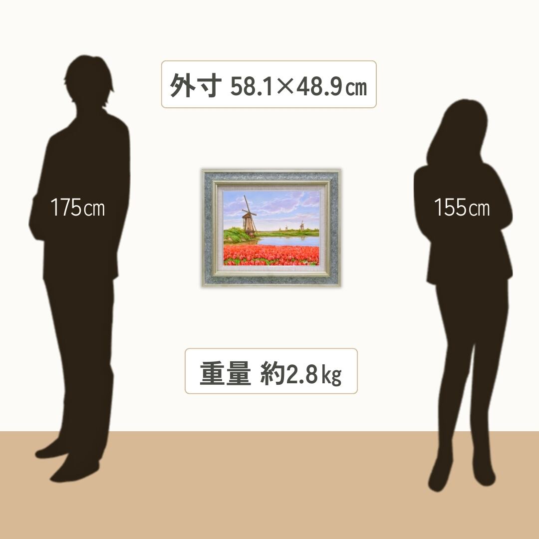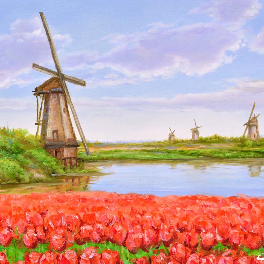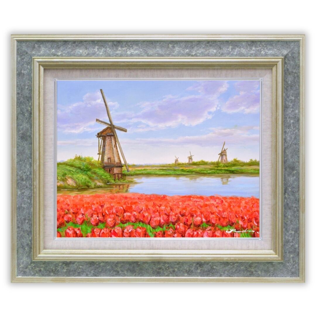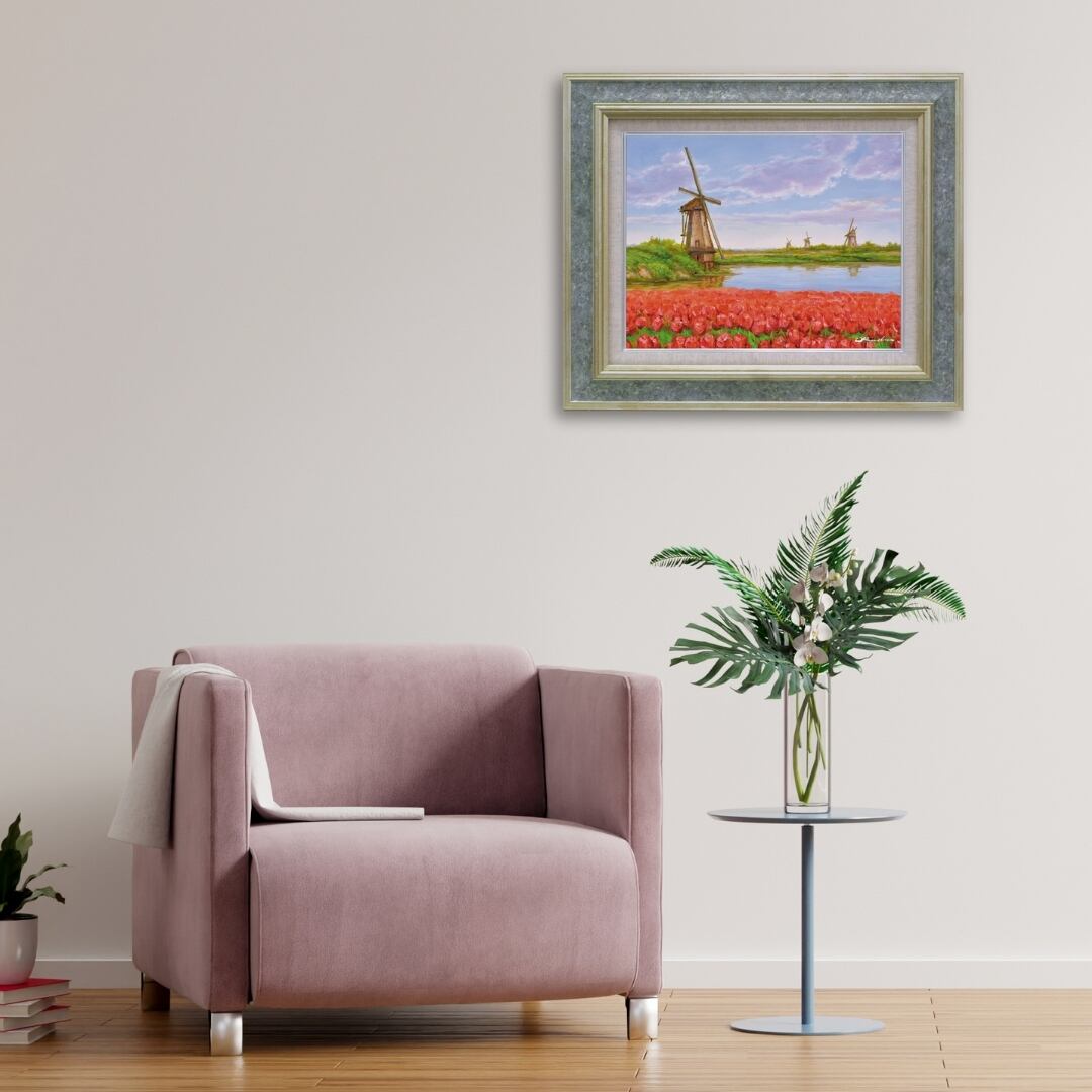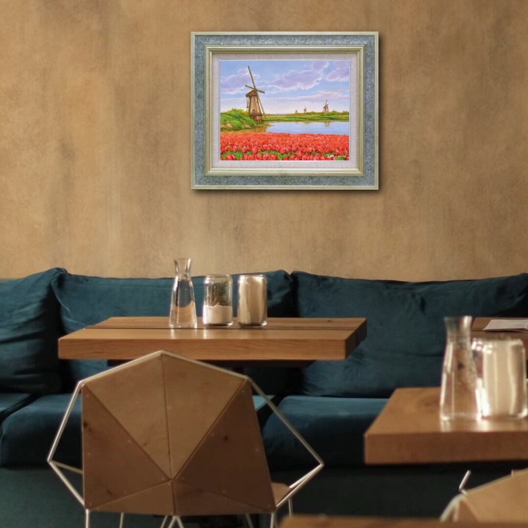 赤く咲き誇るチューリップ畑と、静かに佇む風車が織りなす穏やかな風景が印象的なインテリアアートです。空の淡いブルーと花々の鮮やかな赤のコントラストが見事で、観る人の心を明るく照らします。油絵ならではの厚みあるタッチが花びらの立体感や風の流れを表現し、まるで春の風が吹き抜けるような爽快さを感じさせます。柔らかな光と水面の映り込みが美しく、自然の息吹をそのまま閉じ込めたような心癒されるアート作品です。