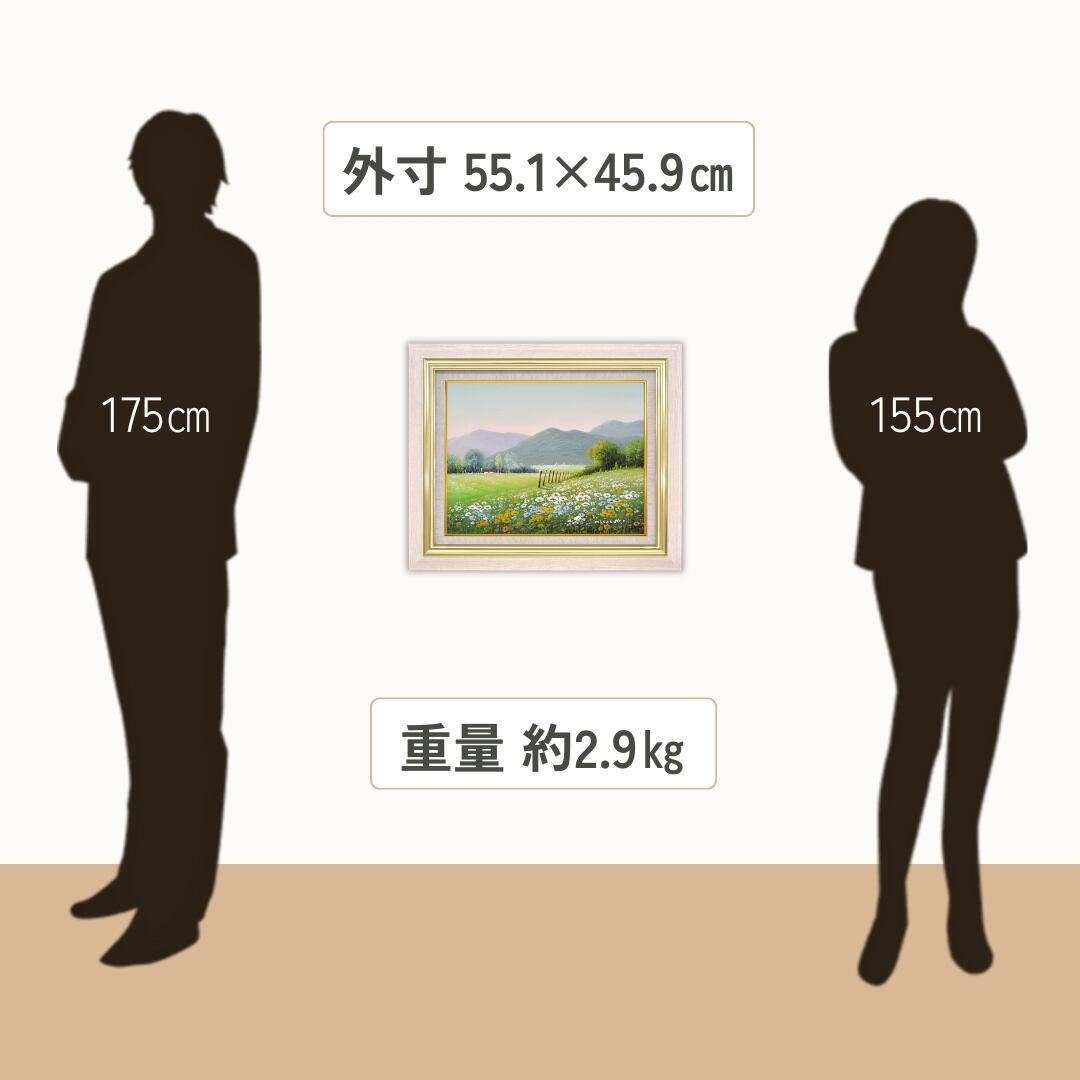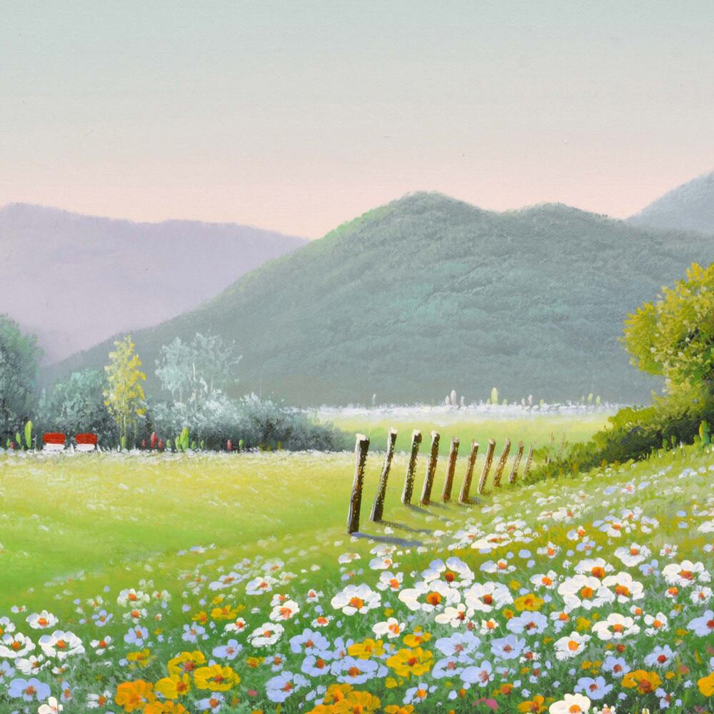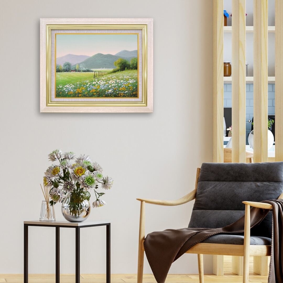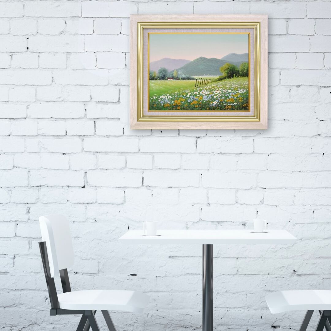 やわらかな朝の光を受け、咲き誇る野の花と緑豊かな丘を描いた穏やかなインテリアアートです。淡いピンクやグリーンのグラデーションが美しく、早朝の澄んだ空気感まで伝わってくるよう。油彩ならではの優しいタッチで表現された草花や遠くの山並みが、静けさと生命の息吹を同時に感じさせます。シンプルながらも奥行きを感じる構図が、心に穏やかな余韻を残すアート作品です。