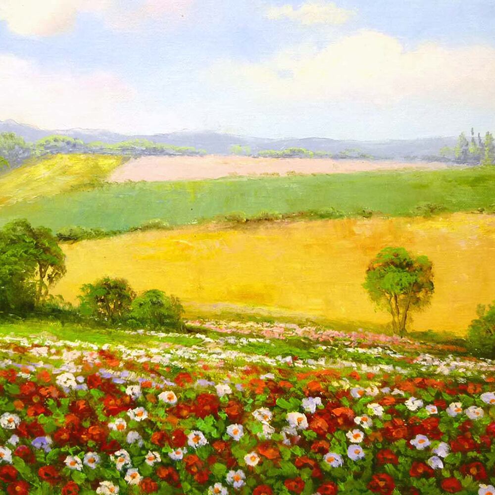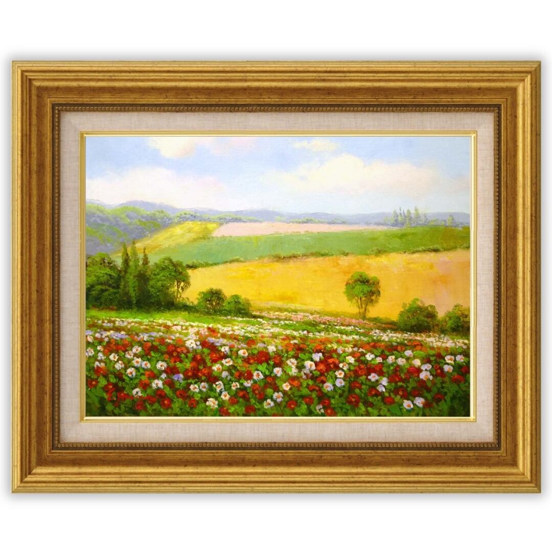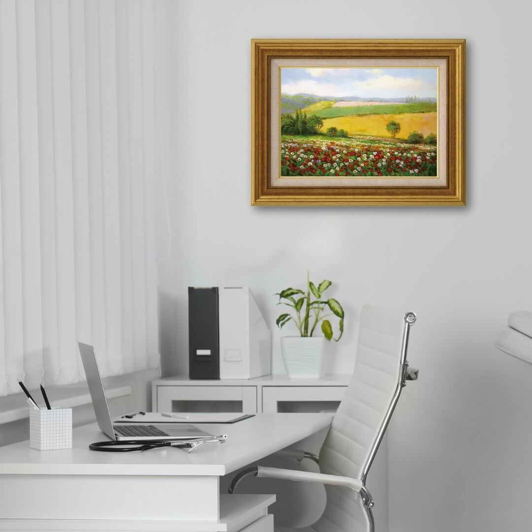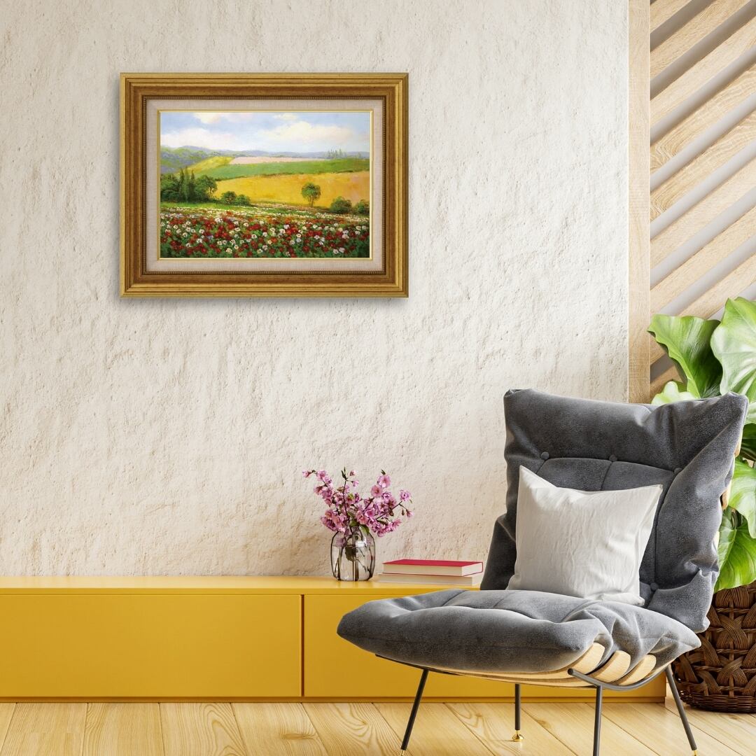 春の訪れを感じさせる、優しい光と色彩に満ちたインテリアアートです。赤・白・ピンクの花々が広がる花畑と、なだらかな丘陵の緑と金色の野原が織りなす風景は、まるで風がそよぐ音まで聞こえてくるよう。遠くに霞む山並みや柔らかな空のトーンが、穏やかで心安らぐ情景を描き出しています。油彩ならではの重なり合う色の深みが、自然の豊かさと春の生命感を見事に表現したアート作品です。