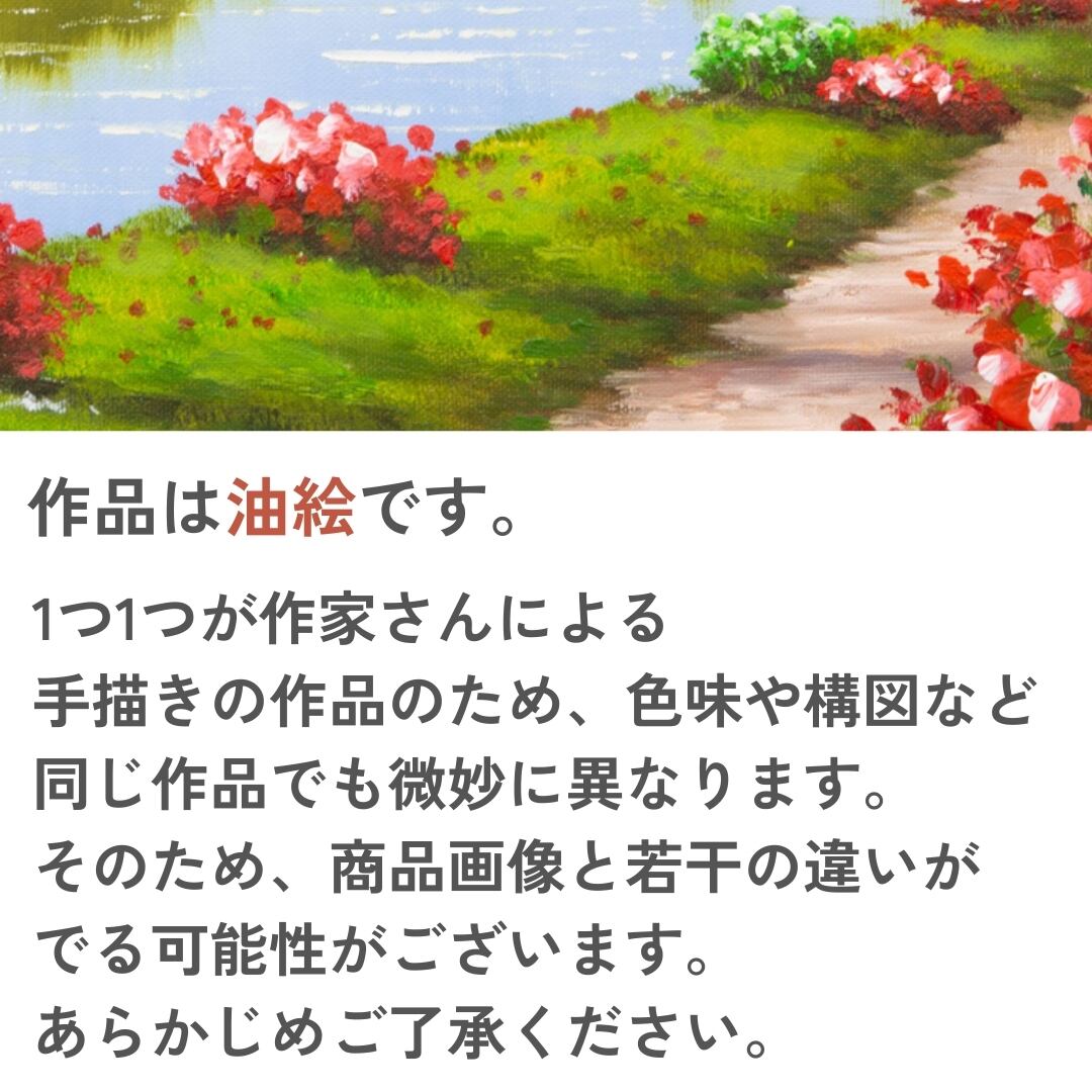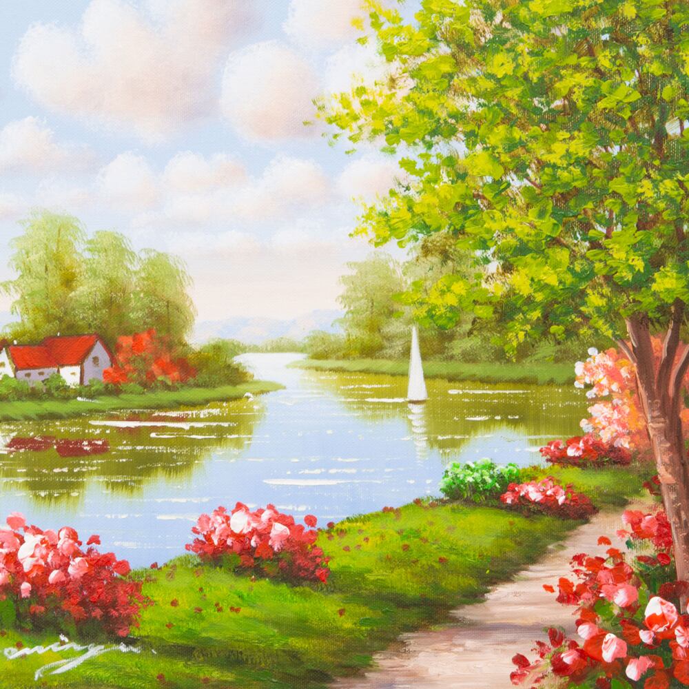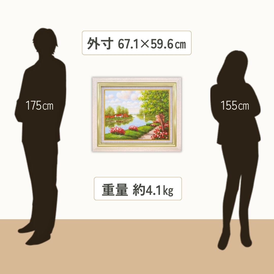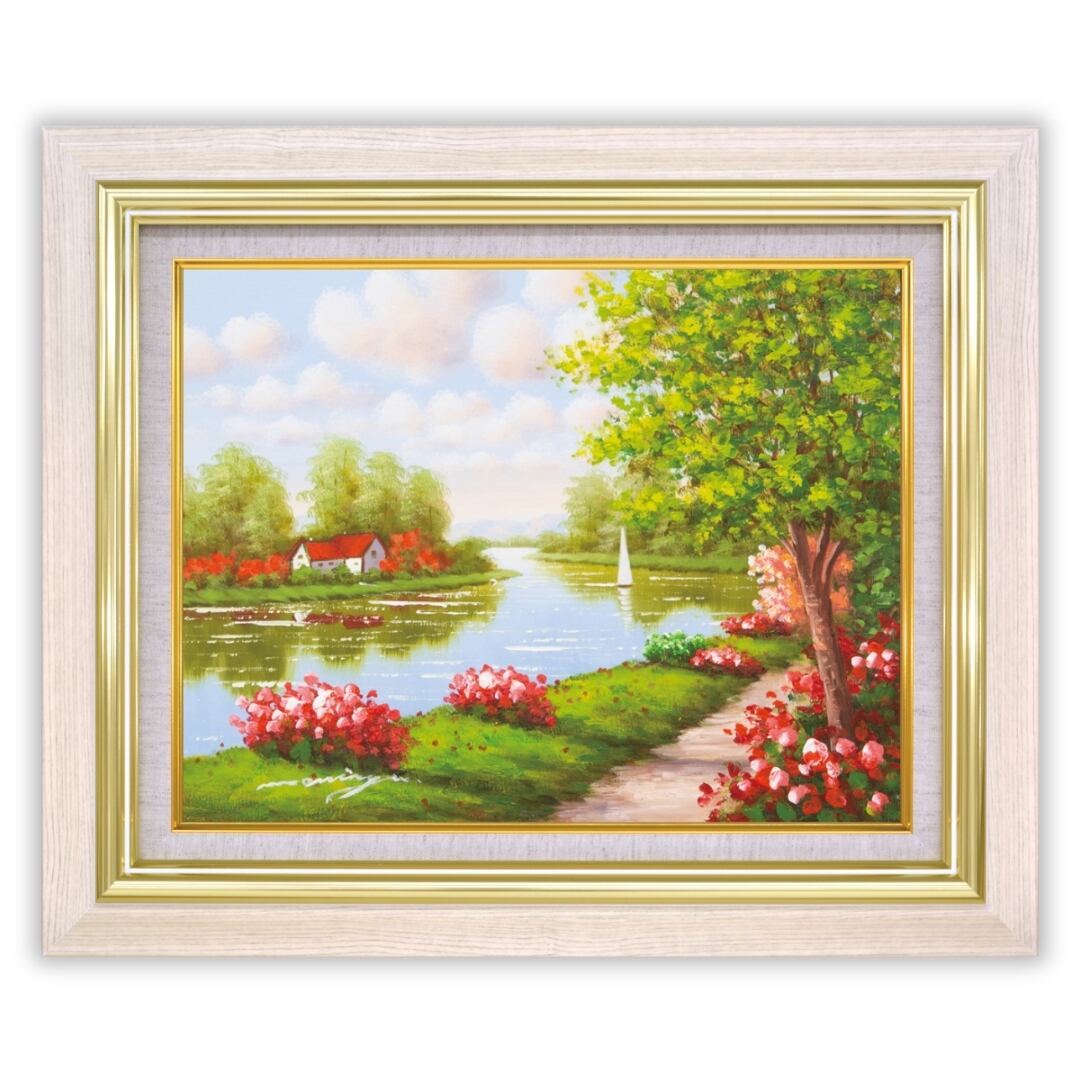 柔らかな光に包まれた水辺の風景を描いた、心安らぐインテリアアートです。湖畔に咲く色とりどりの花々、緑に輝く木々、そして赤い屋根の家が、どこか懐かしく温かな情景を生み出しています。穏やかに流れる水面にはヨットが浮かび、静寂と爽やかさが同居する美しい構図。油彩特有の豊かな色の重なりと筆のタッチが、自然の息づかいを感じさせる魅力的なイラスト作品です。