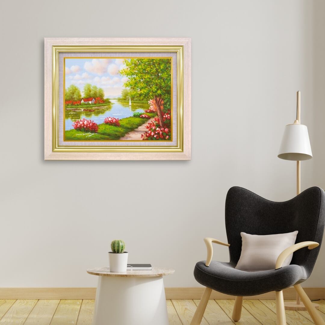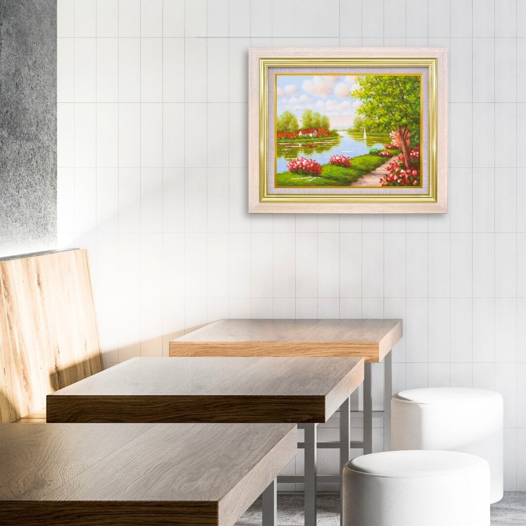 この額縁付きの風景アートは、リビングに飾れば日常に癒しと彩りを与え、四季の中にいるような開放感をもたらします。柔らかな色調がインテリアに自然と溶け込み、空間を明るく優しい印象に変えてくれます。また、オフィスに飾れば、緑と水辺の穏やかな風景が心をリフレッシュさせ、集中力を高める効果も。見るたびに安らぎを感じる、上質なインテリアアートとしておすすめです。