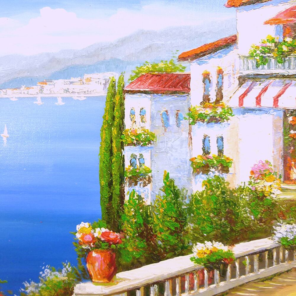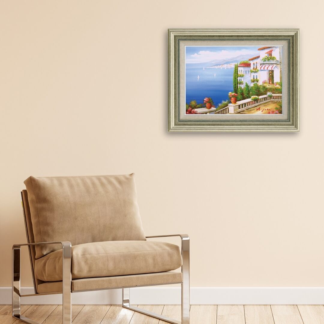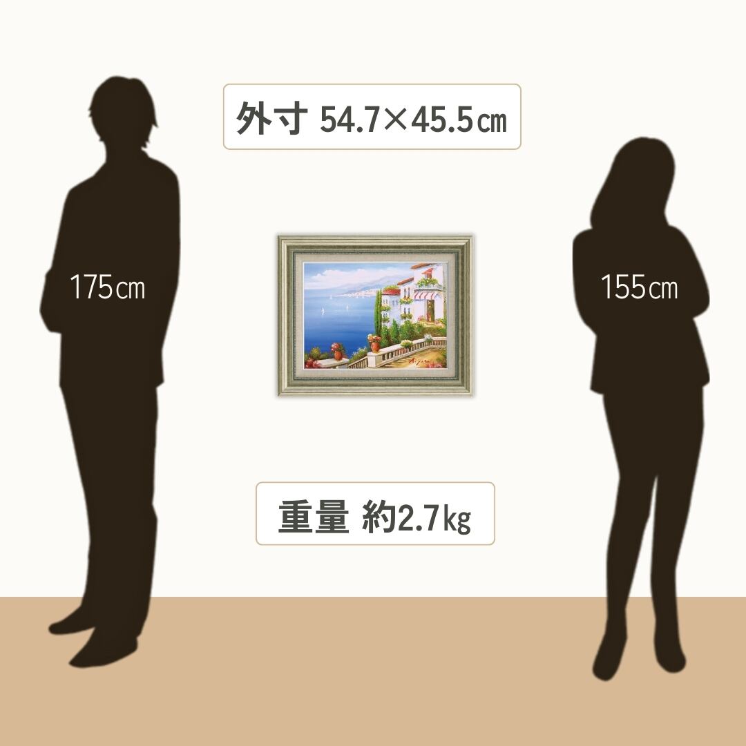 この額縁付きの油彩アートは、リビングに飾ることで空間に爽やかな風を運び、南欧のリゾートを思わせる開放感をもたらします。白と青を基調とした柔らかな色調は、どんなインテリアにも調和し、上質で明るい雰囲気を演出。また、エントランスに飾れば、訪れる人に清涼感と品のある印象を与え、空間全体を華やかに引き立てます。日常の中にリゾート気分を取り入れたい方に最適なインテリアアートです。