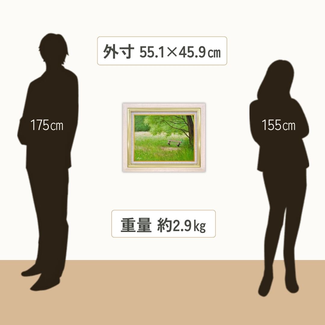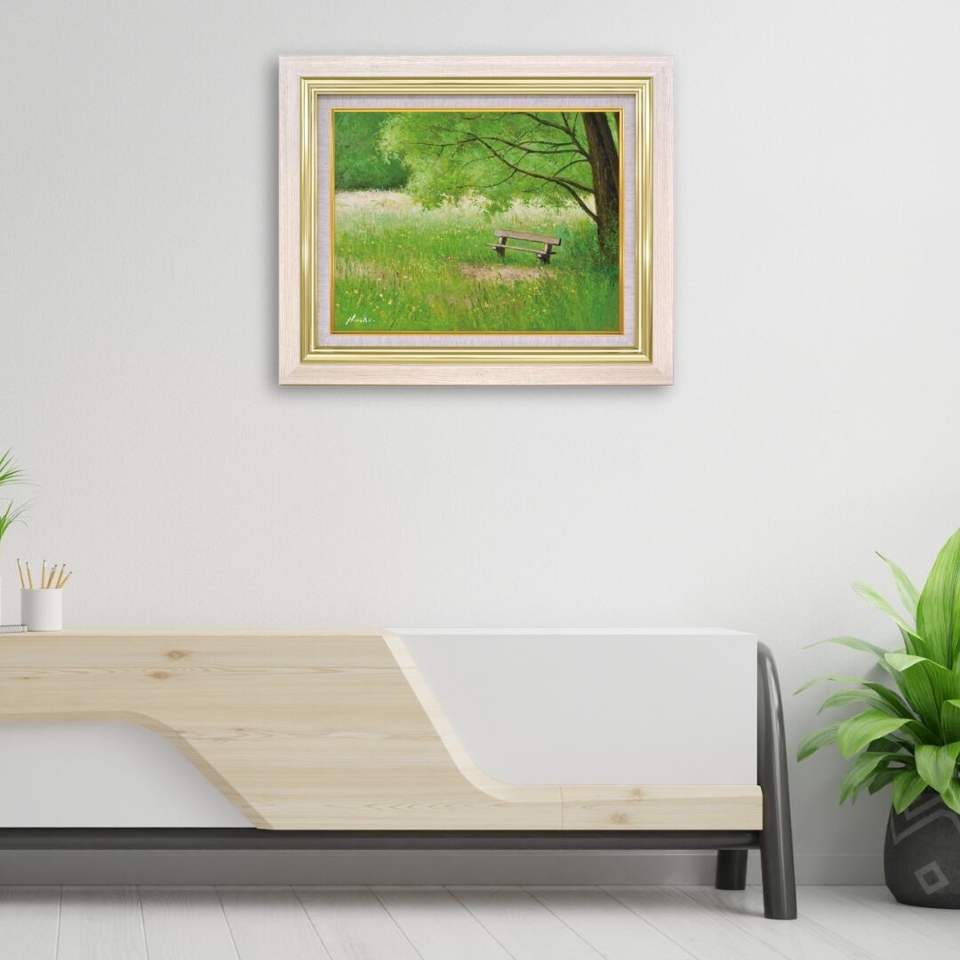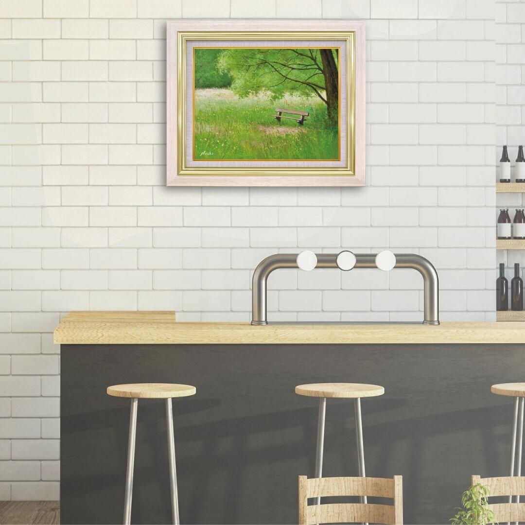 この額縁付きの風景画は、リビングに飾れば、緑の潤いと穏やかな空気が空間を包み込み、