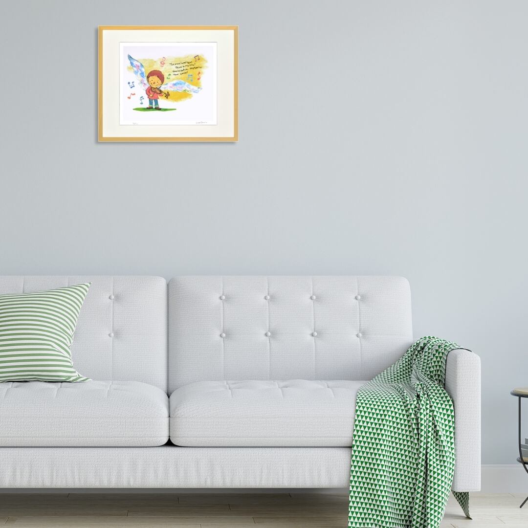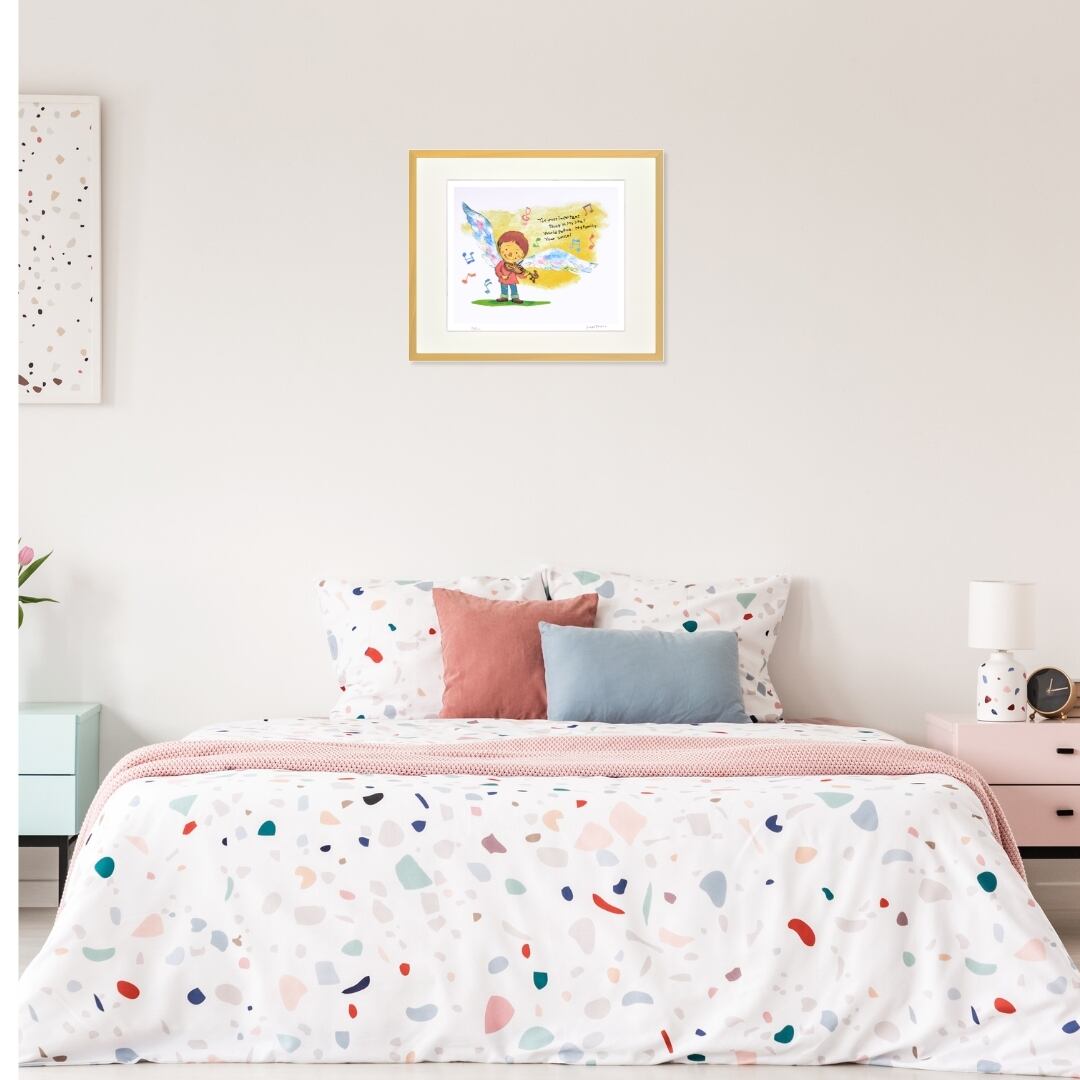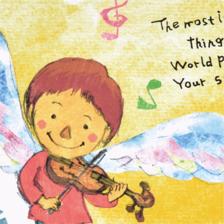 優しいタッチで描かれた少年がバイオリンを奏でる、温もりあふれるイラストです。柔らかな黄色の背景と、羽のように広がる透明感のあるブルーとピンクの翼が美しく調和し、心に静かな感動を与えます。絵の中の言葉 “The most important thing in my life? World Peace. My family. Your smile!”(私の人生で一番大切なもの? 世界の平和。家族。そしてあなたの笑顔!)が、見る人に幸せの本質を思い出させてくれます。優しさと希望を描いたこのアートは、日々の生活に彩りと安らぎをもたらすインテリアアートとして最適です。