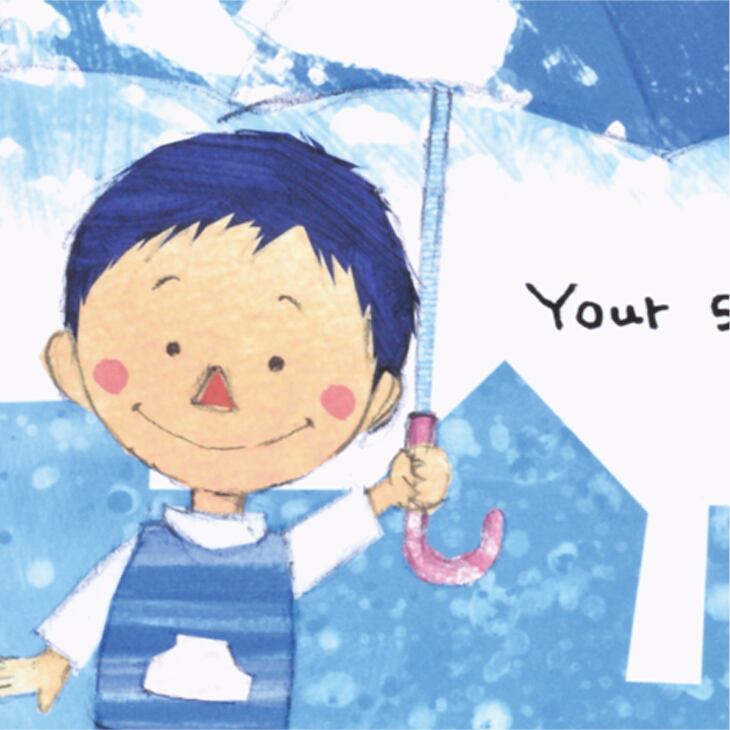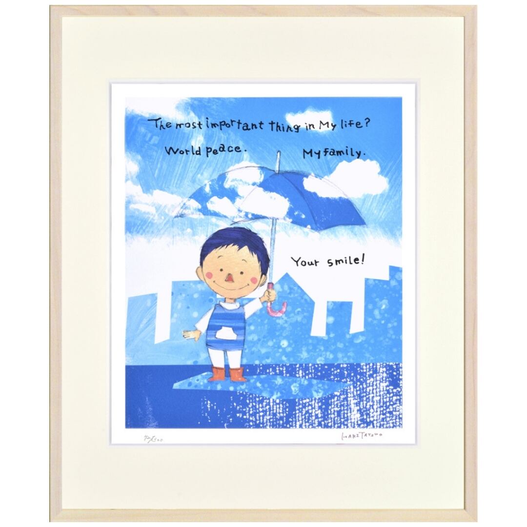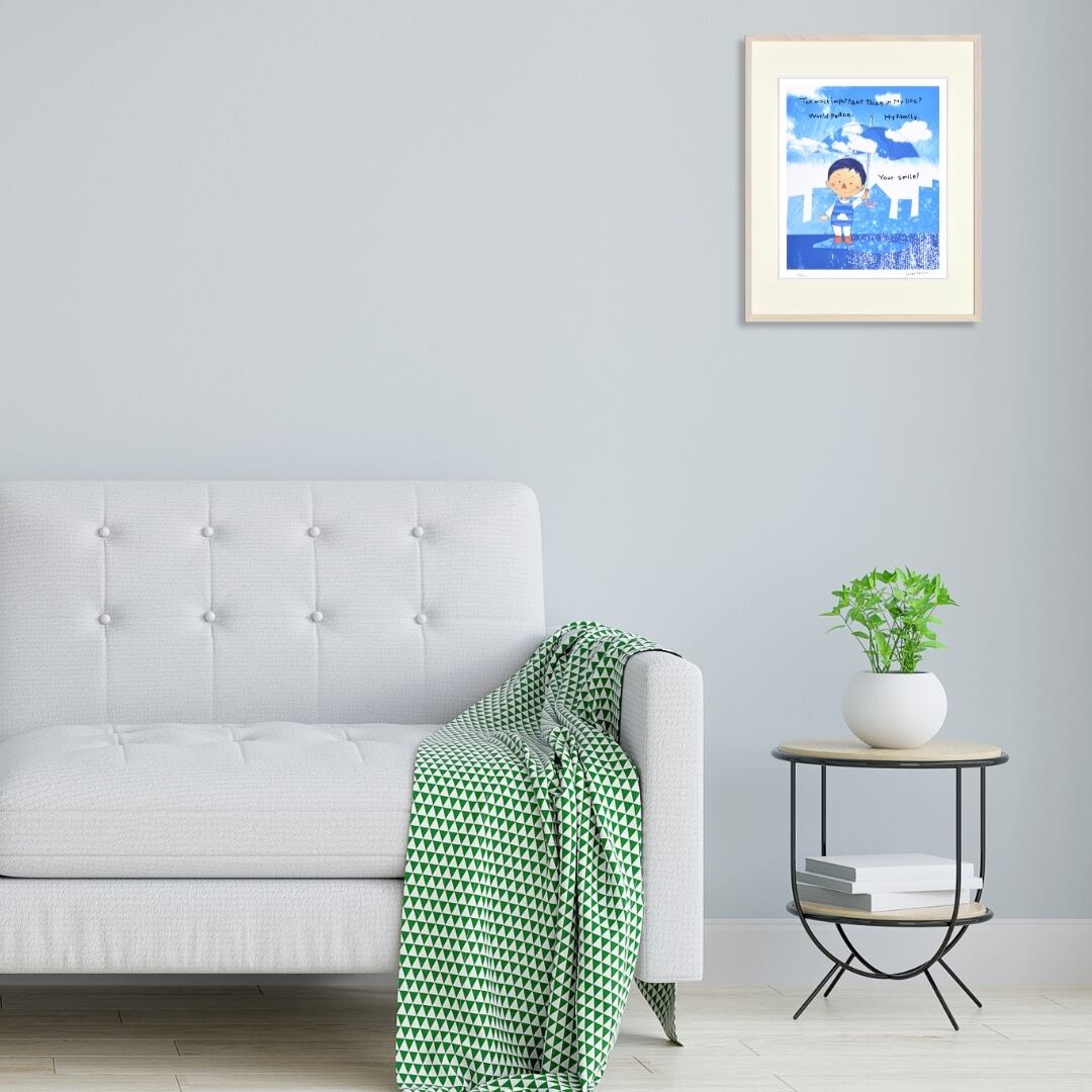 青空の下、傘を手にした少年が微笑む姿が印象的なイラストです。透き通るようなブルーのグラデーションが清涼感を与え、背景に描かれた白い雲と街並みが、爽やかな空気を感じさせます。少年の笑顔はどこか無邪気で、見る人に安心と優しさを届けます。英語のメッセージ “The most important thing in my life? World peace. My family. Your smile!”(私の人生で一番大切なもの? 世界の平和。家族。そしてあなたの笑顔!)が添えられ、あたたかな想いがまっすぐに伝わります。清らかな青が心を落ち着かせる、穏やかで爽やかなインテリアアートです。