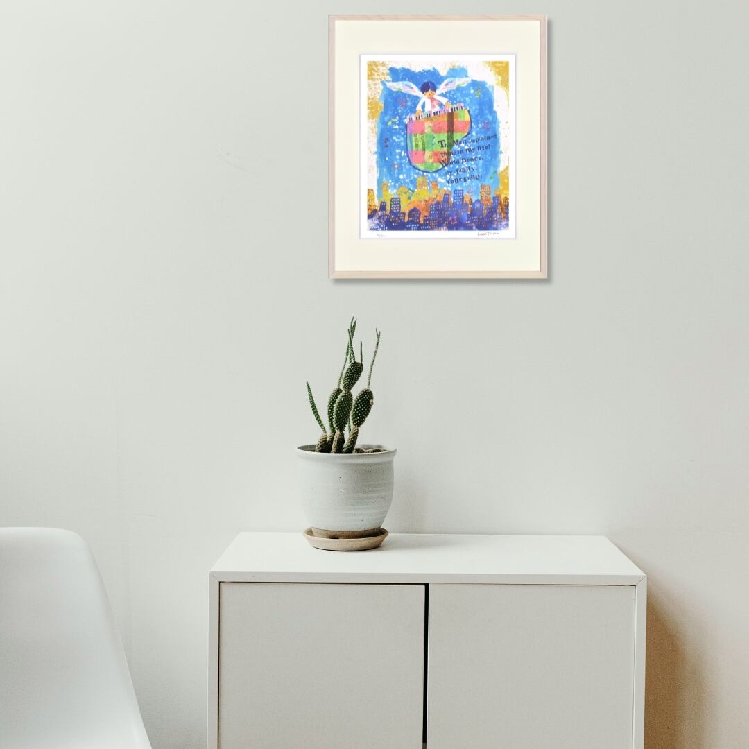 夜の街を見下ろしながら、鍵盤を奏でる少年を描いた幻想的なイラストです。鮮やかなブルーとオレンジのコントラストが美しく、まるで音楽が夜空に響いているような情景を表現しています。羽を広げた少年の姿には、自由と希望を感じさせる力強さがあります。メッセージ “The most important thing in my life? World peace. My family. Your smile!”(私の人生で一番大切なもの? 世界の平和。家族。そしてあなたの笑顔!)が添えられ、温かい想いが街全体に広がるようです。リズムと色彩が融合した、感性を刺激するインテリアアートです。
