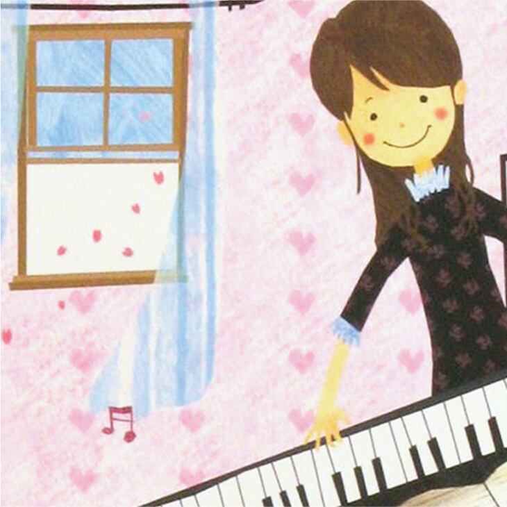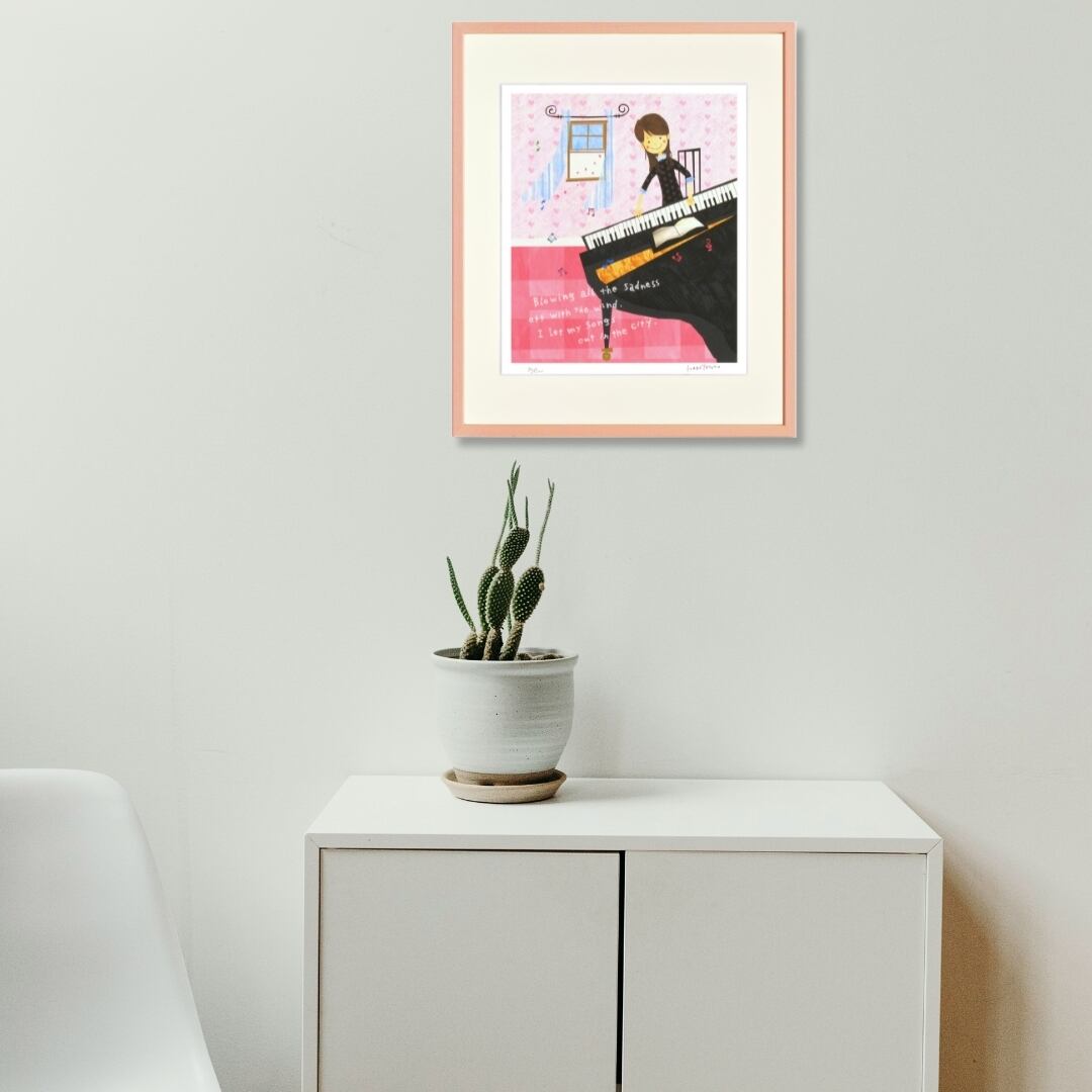 ピンクを基調にしたやさしい空間の中で、ピアノを奏でる女性を描いたイラストです。柔らかな色彩と細やかなタッチが、春の日の穏やかさを感じさせます。開いた窓から差し込む風がカーテンを揺らし、部屋いっぱいに音が広がっていくような臨場感が伝わります。黒いピアノの存在感と背景の淡いトーンの対比が美しく、温もりのあるメロディが聞こえてきそうな構図です。穏やかで優しい時間が流れるような、見る人の心を癒すインテリアアートです。