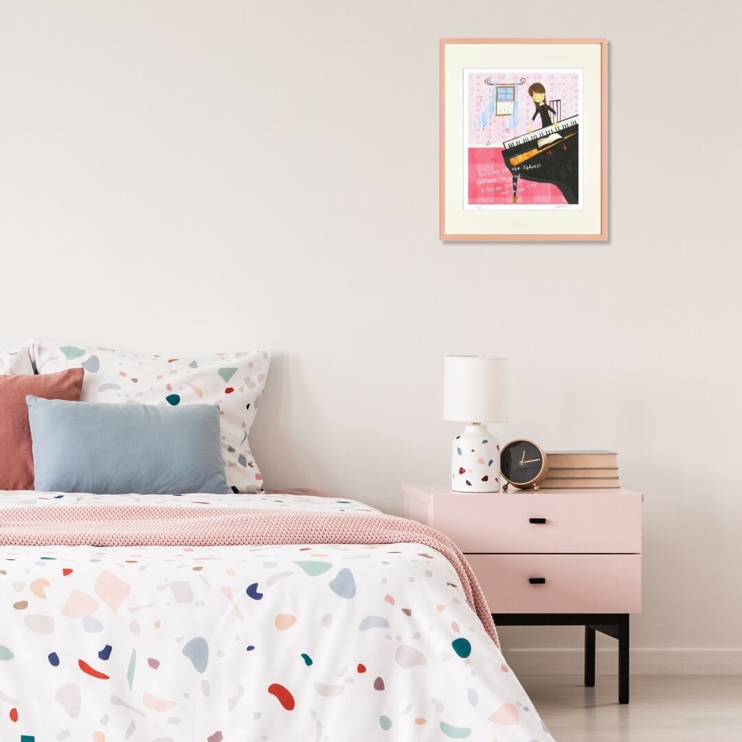 この作品は、額縁付きのインテリアアートとして、お部屋に明るさと温かみを添えます。ピンクとブルーのやわらかな色調が空間をやさしく包み、リビングや寝室などを心地よい雰囲気に整えます。朝の光を受けるとさらに華やかに、夜の照明の下では落ち着いた印象に変化し、時間とともに違う表情を楽しめます。音楽のある生活を思わせるようなデザインで、見るたびに穏やかな気持ちを運んでくれるアートです。暮らしに彩りと安らぎを与える上質なイラスト作品です。