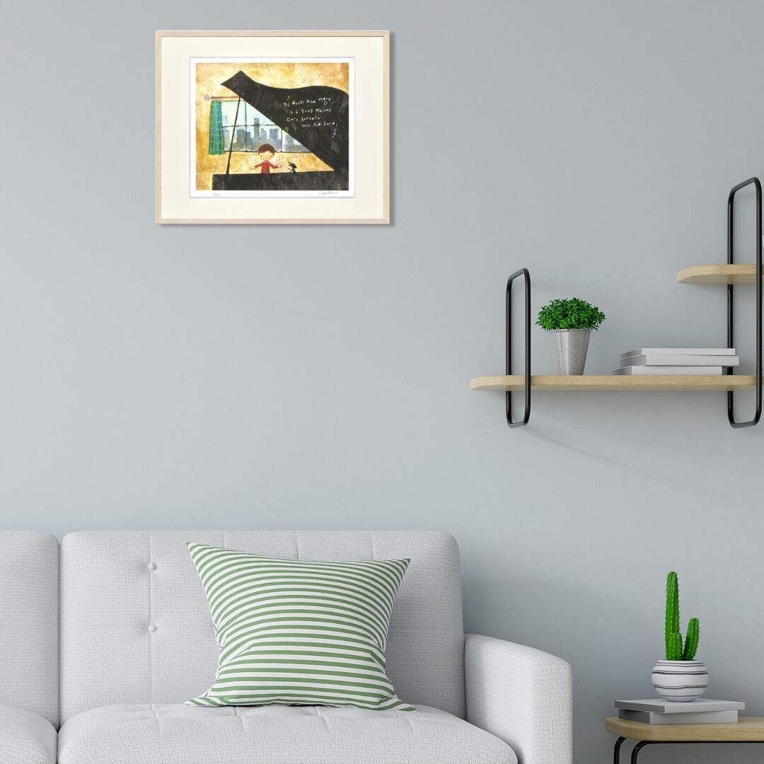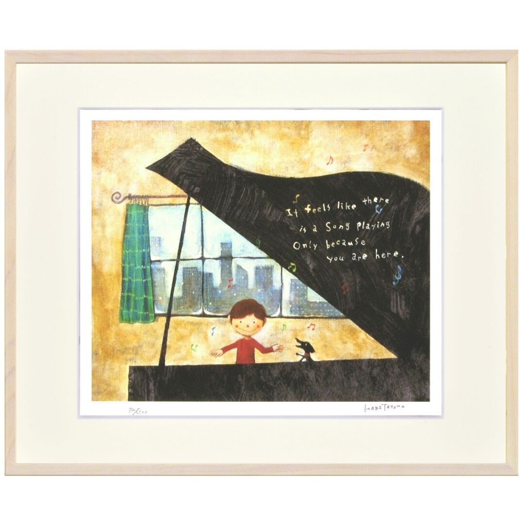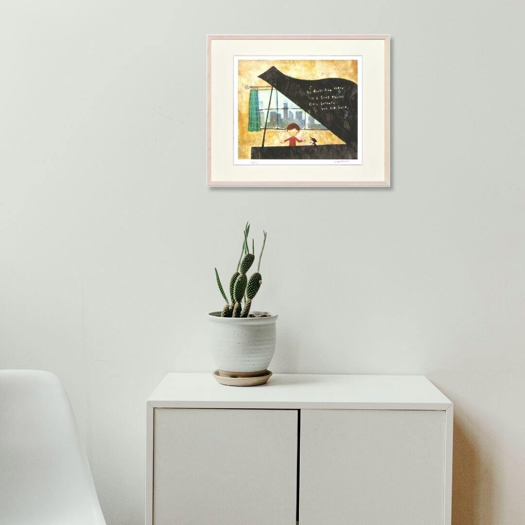 大きなグランドピアノの傍らで、嬉しそうに手を広げる少年と、そばに寄り添う小さな犬が描かれた温かみのあるイラストです。窓の外には街並みが広がり、日常の中の小さな幸せを感じさせる穏やかな風景が広がっています。ピアノの黒と背景の柔らかなベージュのコントラストが美しく、音の響きを感じさせる構図が印象的です。シンプルながらも深い感情がこもった表現で、見る人にやさしいぬくもりを届けるインテリアアートです。