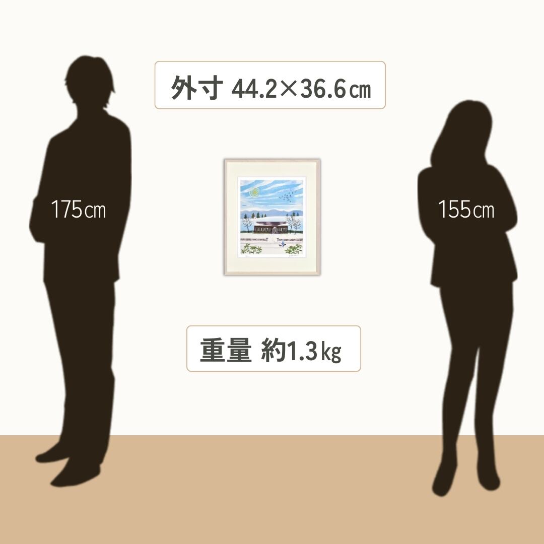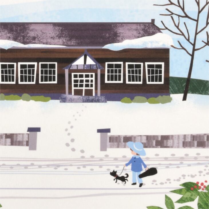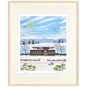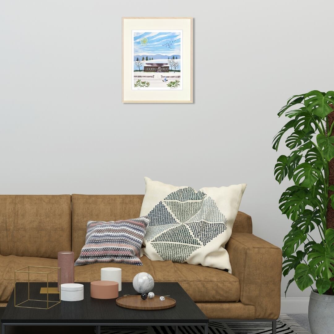 真っ白な雪景色の中に、昔ながらの木造校舎と青空が描かれた穏やかなイラストです。冬の静けさと温もりが同居するような構図で、澄んだ空気感が伝わってきます。上空を渡る鳥の群れや、雪道を歩く人と犬の姿が、寒い季節の中にも確かな生命のぬくもりを感じさせます。シンプルな筆致ながらも、空のグラデーションや雪の質感表現が美しく、眺めるほどに心が落ち着いていく一枚です。懐かしさと優しさに包まれた、穏やかな時間を描いたインテリアアートです。