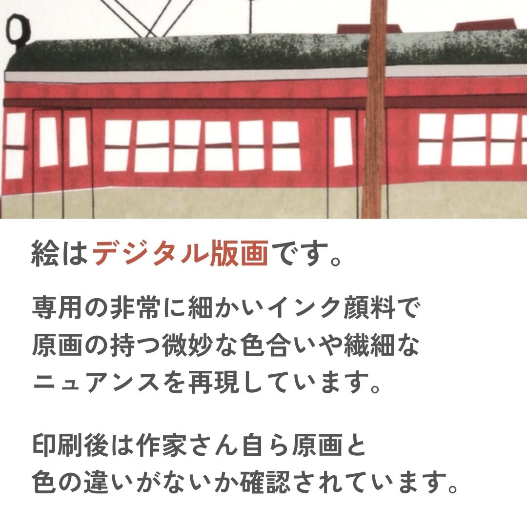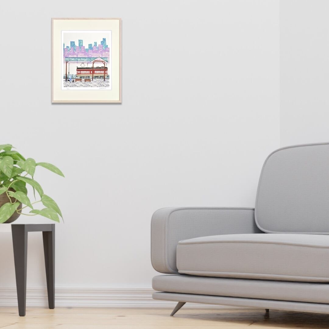雪が舞う街の中を、赤い路面電車が静かに走る様子を描いたイラストです。淡い紫と青で構成された街並みが幻想的で、冬の空気の透明感が美しく表現されています。ホームにはベンチが並び、青いコートを着た人と黒い犬が寄り添う姿が、日常のあたたかさを感じさせます。レトロな電車のデザインや街の光の描写がどこか懐かしく、過ぎ去った季節の記憶を呼び起こすような情緒があります。静けさの中に優しさが漂う、心に残るインテリアアートです。