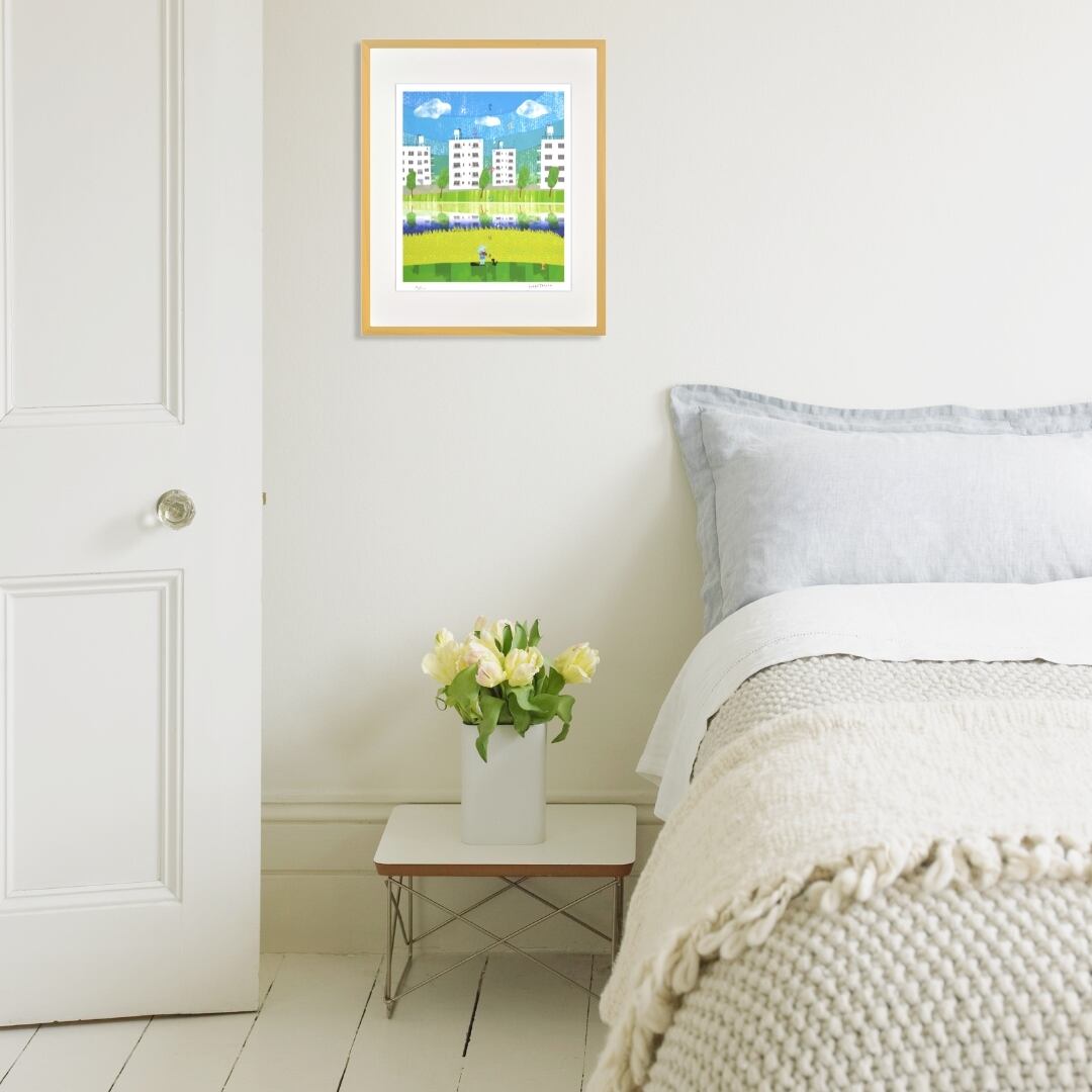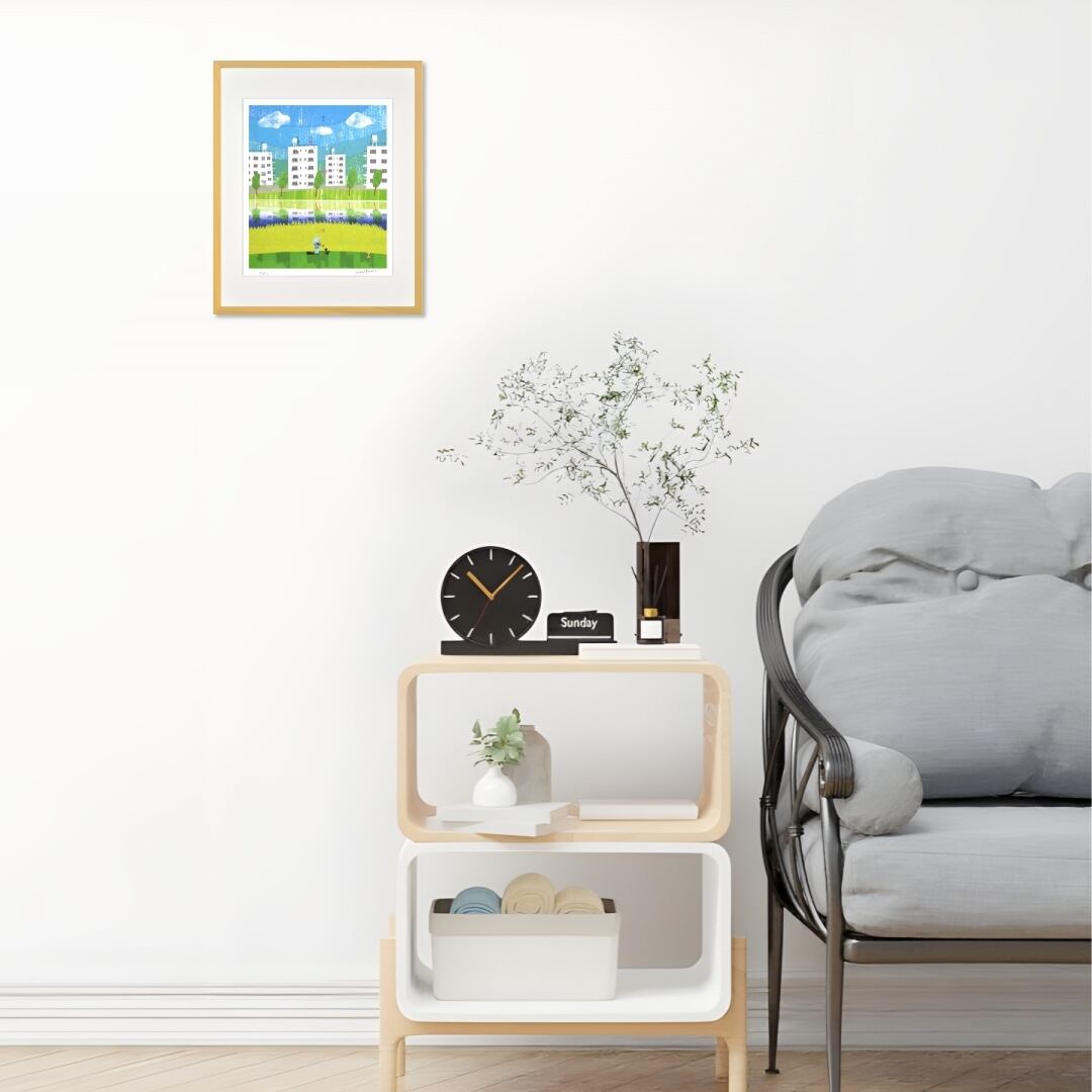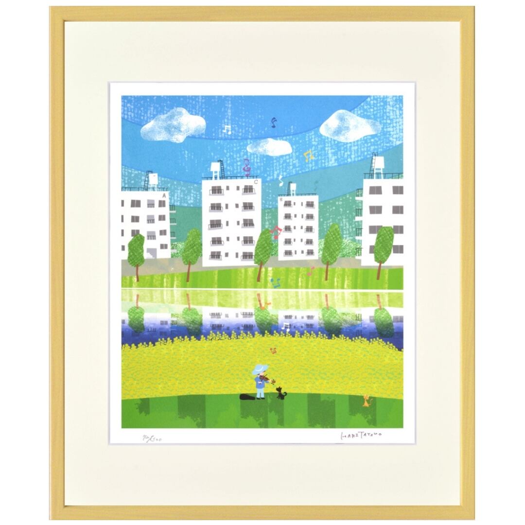 春の陽ざしを受けて、菜の花畑が一面に広がる風景を描いたインテリアアートです。背景には白い団地が並び、青い空と緑の木々が心地よいコントラストを生み出しています。穏やかな川面には街の姿が映りこみ、季節の明るさと静けさが見事に調和しています。畑の前には帽子をかぶった人と犬の姿があり、音楽のように流れるやさしい時間を感じさせます。春の風景の中に、何気ない日常の美しさが詰まったイラストです。