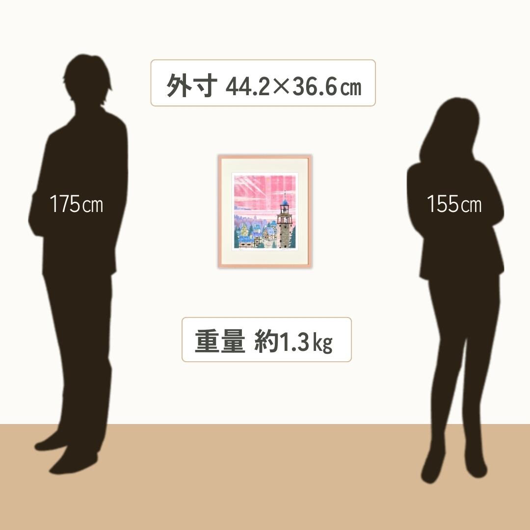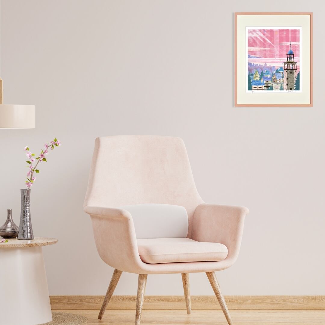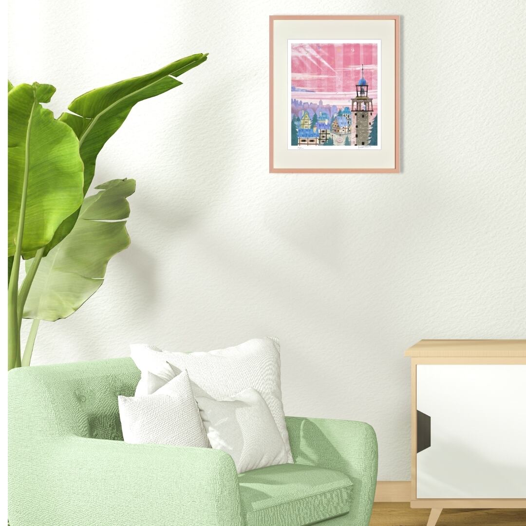 ピンクの空と青い屋根のコントラストが美しく、部屋にやさしい明るさを添えてくれます。