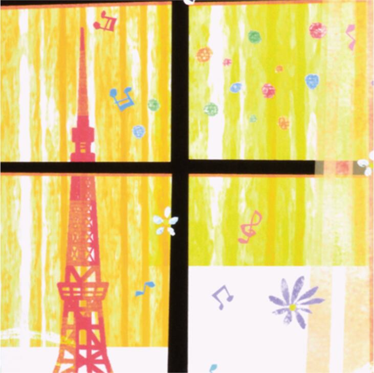 カラフルなカーテン越しに見える街並みと赤い塔が、日常の中に小さな非日常を感じさせます。