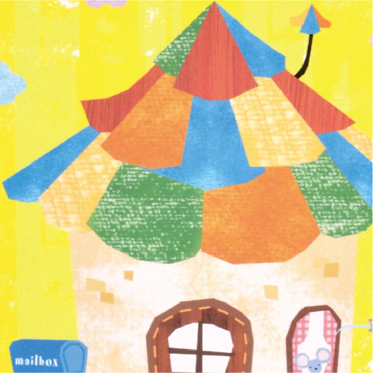カラフルな屋根がまるで音楽を奏でるように輝き、背景の黄色がやさしい幸福感を広げています。