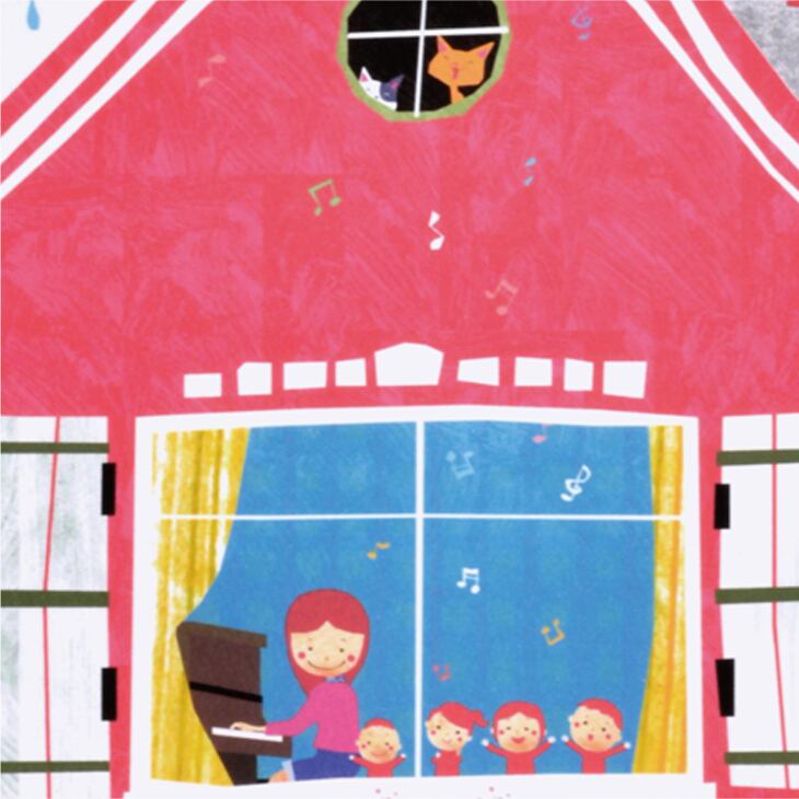 やわらかな雨の中、赤い屋根の家の窓辺で家族が音楽を奏でる温かな情景が描かれたアート。