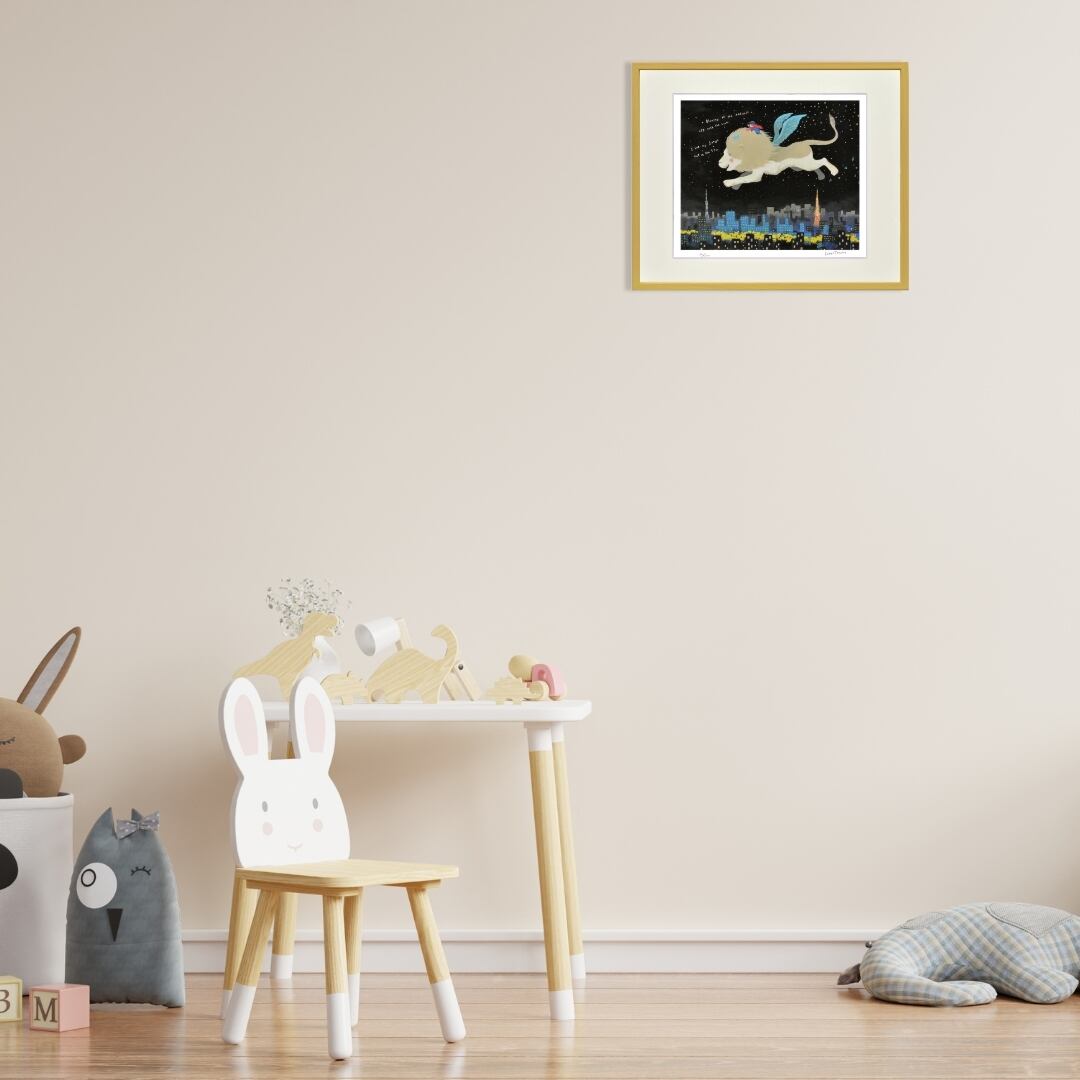少女とライオンの絆が感じられるこの作品は、希望と勇気をテーマにしたインテリアアートです。