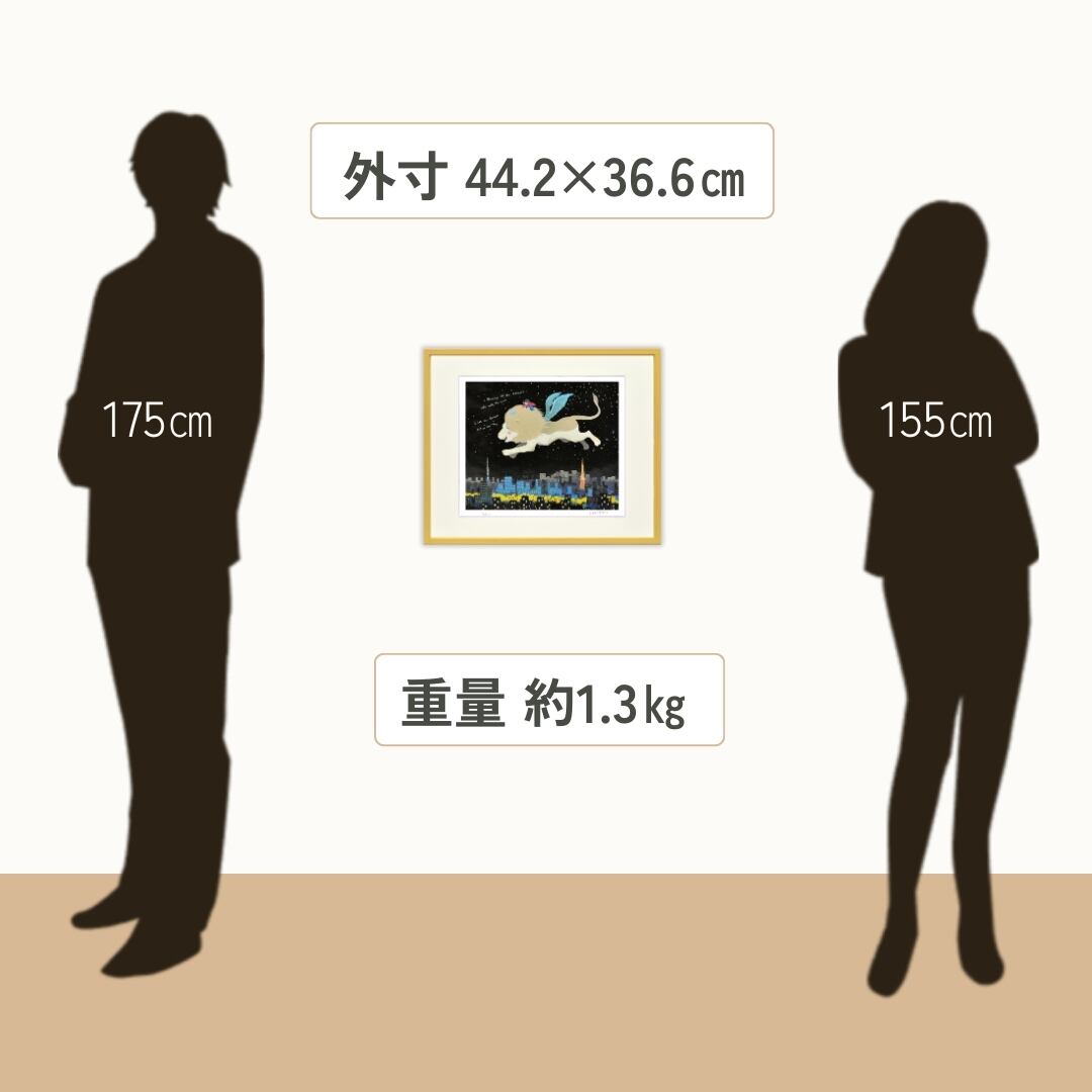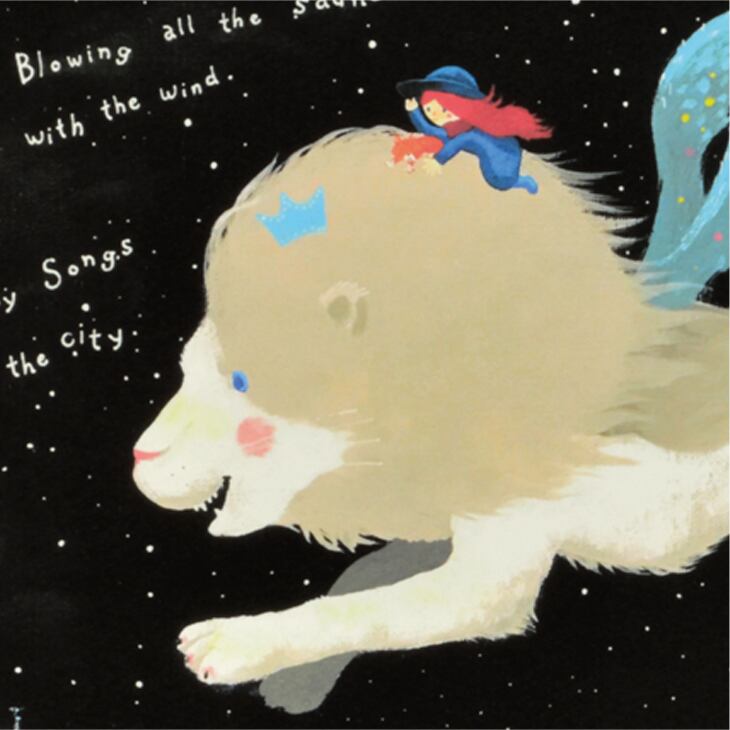 夜空を駆ける白いライオンの背に、赤いマントをまとった少女がそっと乗る幻想的な一枚です。