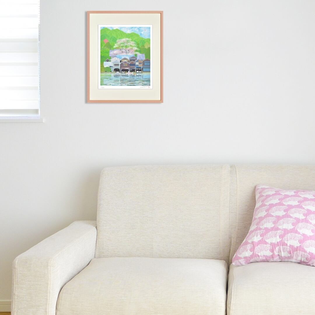 穏やかな水面に映る舟屋の景色をやわらかな光で描いたアート作品です。