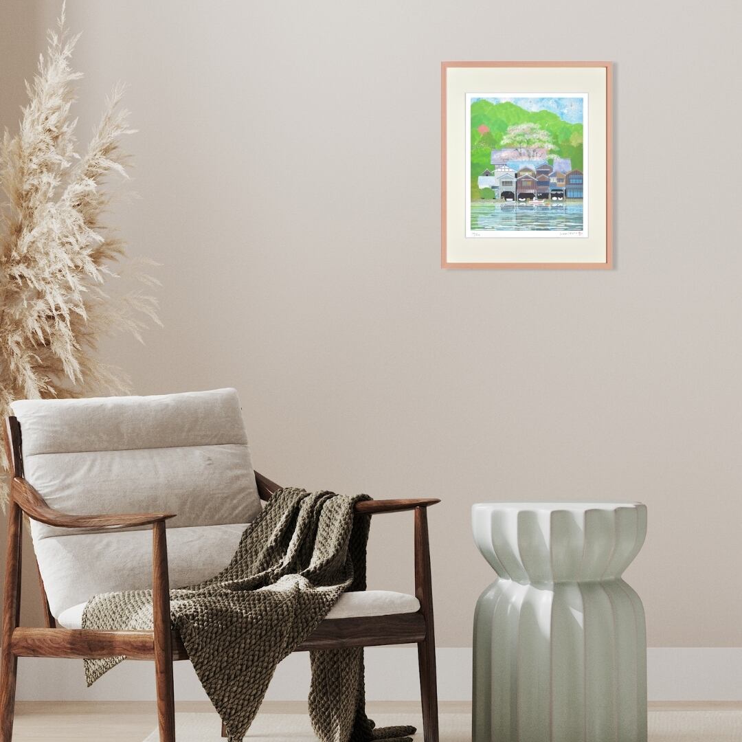 水辺の静けさと春の柔らかな色彩が調和したこのインテリアアートは、