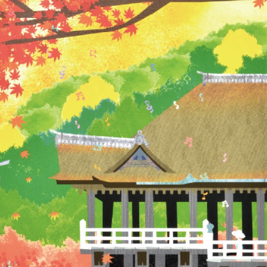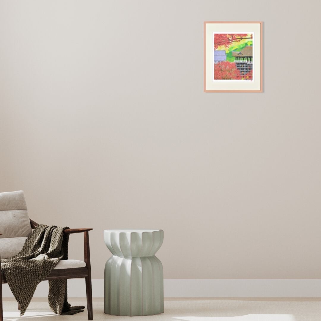 朝焼けに染まる京都・清水寺を鮮やかに描いたアート作品です。