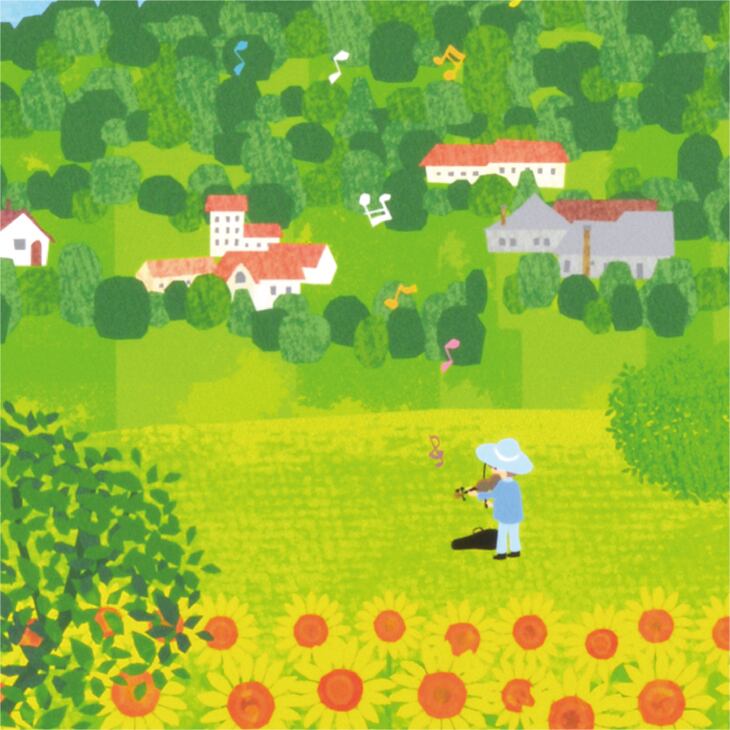 広がる丘の上に咲き誇るひまわり畑を描いたアート作品です。黄金色の花々が風に揺れ、遠くには荘厳な修道院が佇む穏やかな風景が広がります。青空の下で奏でられる音符のような彩りが、生命の喜びと希望を感じさせるイラストです。緑と黄色のコントラストが鮮やかで、まるで夏の光をそのまま閉じ込めたような温かさを持っています。見る人の心に元気と優しさを届けてくれる、心地よい風景画です。