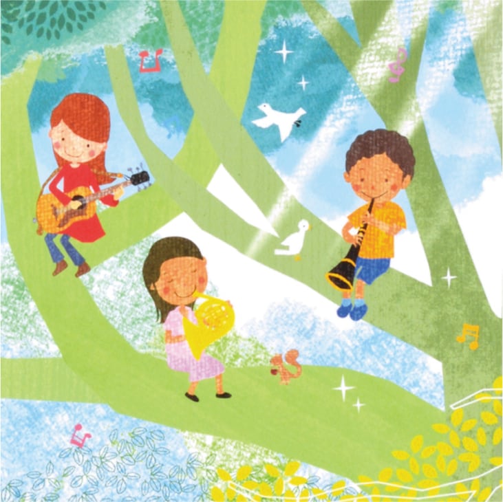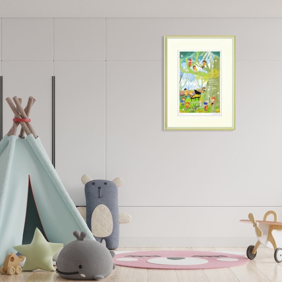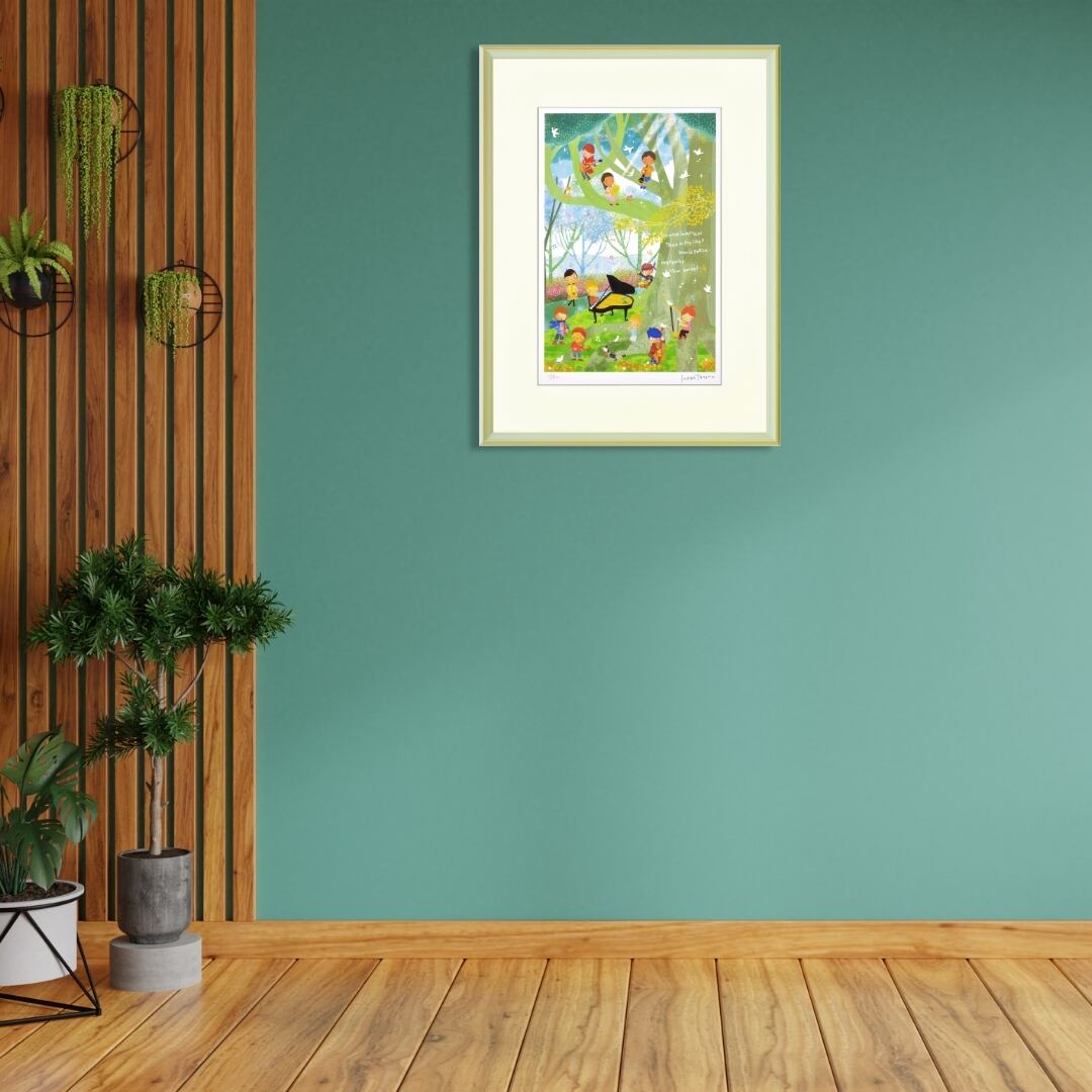 大きな木のもとで子どもたちが楽器を奏でる姿を描いたアート作品です。陽光がやわらかく差し込み、緑の中に響く音色と笑顔が調和する風景は、まるで自然そのものが音楽を奏でているようです。ピアノやバイオリン、ハープなど、それぞれの楽器が持つ温かみが画面全体に広がり、生命の歓びと平和への祈りが感じられます。柔らかな筆致と透明感のある色彩で描かれたこの作品は、観る人の心に穏やかな調和と優しさをもたらす、美しく詩的なアートです。