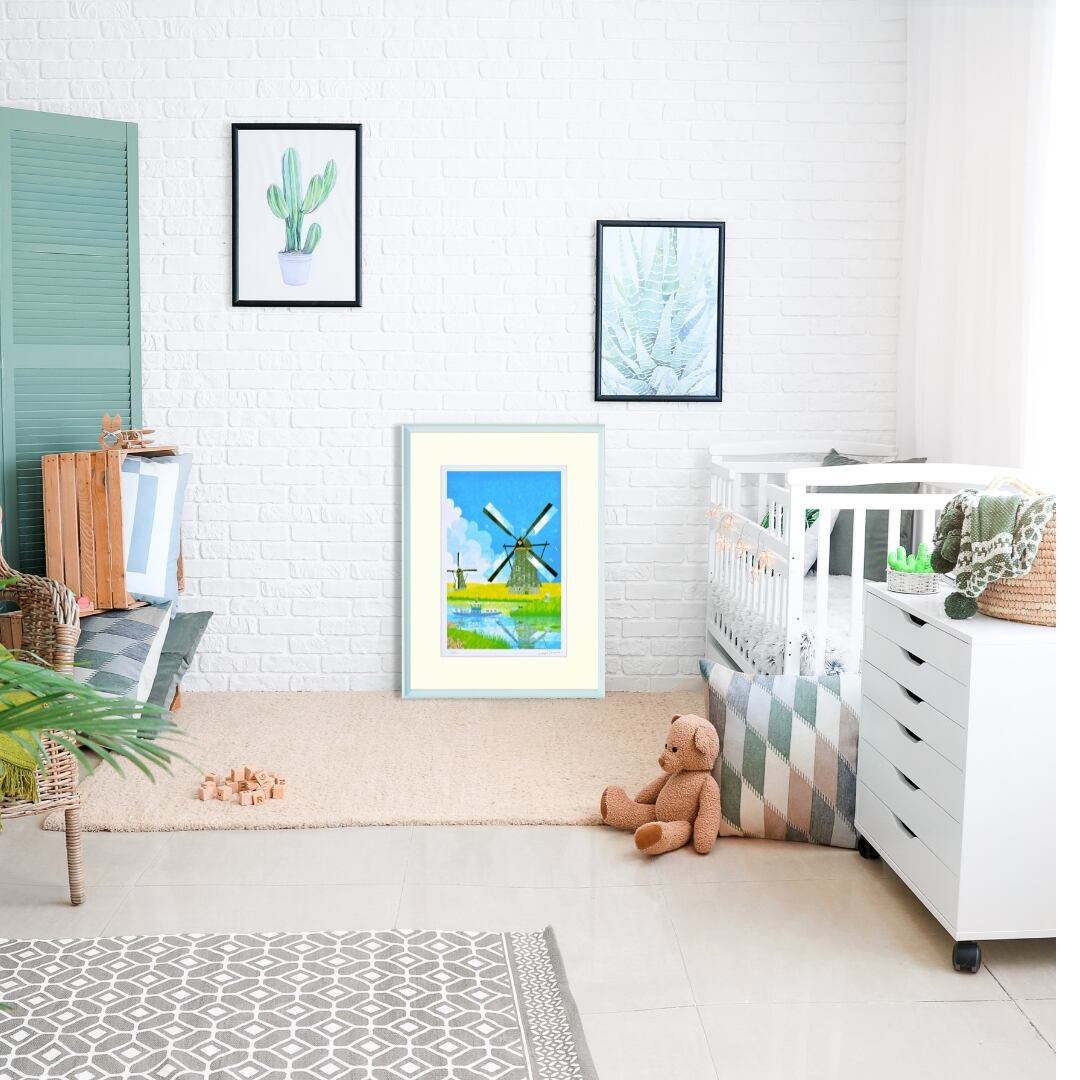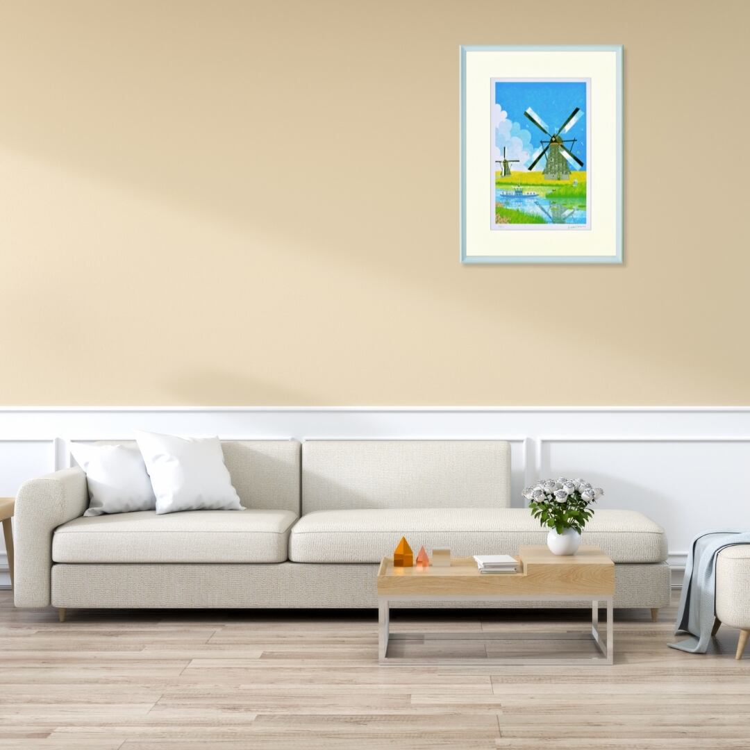 穏やかな水辺と風車の情景が描かれたこのインテリアアートは、空間に爽やかな風を吹き込むような心地よさをもたらします。清々しい青と緑の色調が壁面に明るさを与え、開放感のあるリビングやダイニングにぴったりの作品です。自然と調和する穏やかな構図が、見る人の心を落ち着かせ、日常に癒しとやすらぎを運びます。インテリアに取り入れることで、まるで旅先の風景を眺めているような安堵感を感じられる、美しい風景アートです。