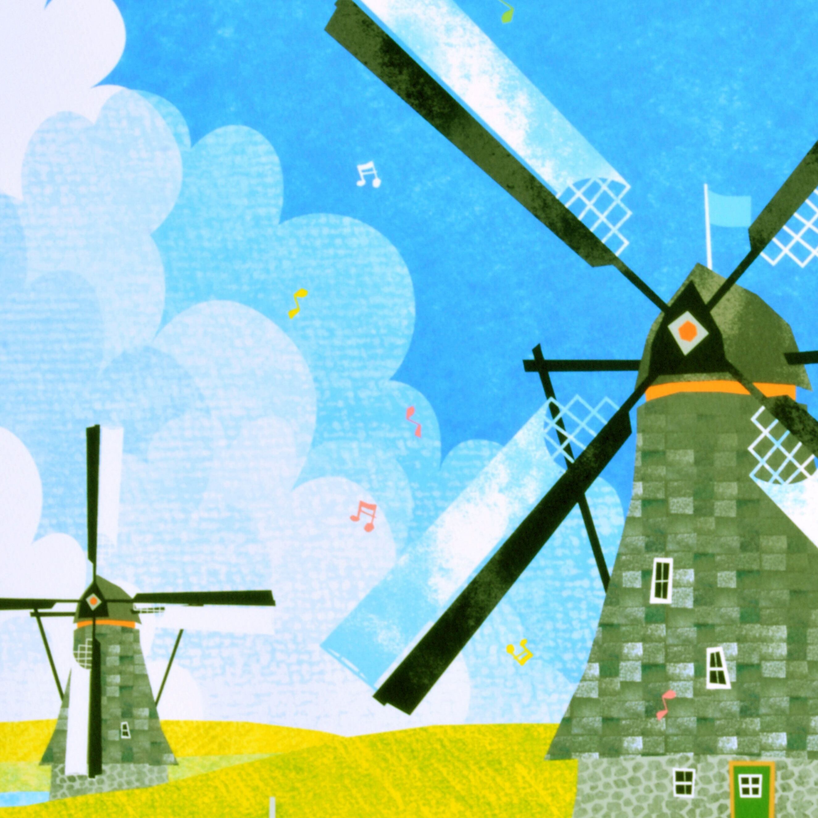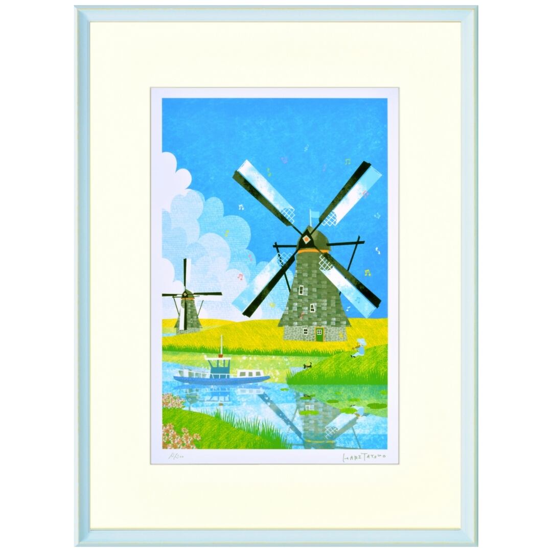 オランダ・キンデルダイクの風景をモチーフに描かれたアート作品です。青空の下に広がる穏やかな運河と風車が、まるで時が止まったかのような静けさをたたえています。水面には風車の姿が美しく映り込み、澄んだ空気と柔らかな光が織りなす風景が心を癒します。遠くに見える風車の列と手前のボートが、自然と人の共存を象徴するように調和し、どこか懐かしいヨーロッパの原風景を思わせます。透明感のある色彩と繊細な筆致が印象的なこのアートは、旅情と安らぎを感じさせる風景作品です。