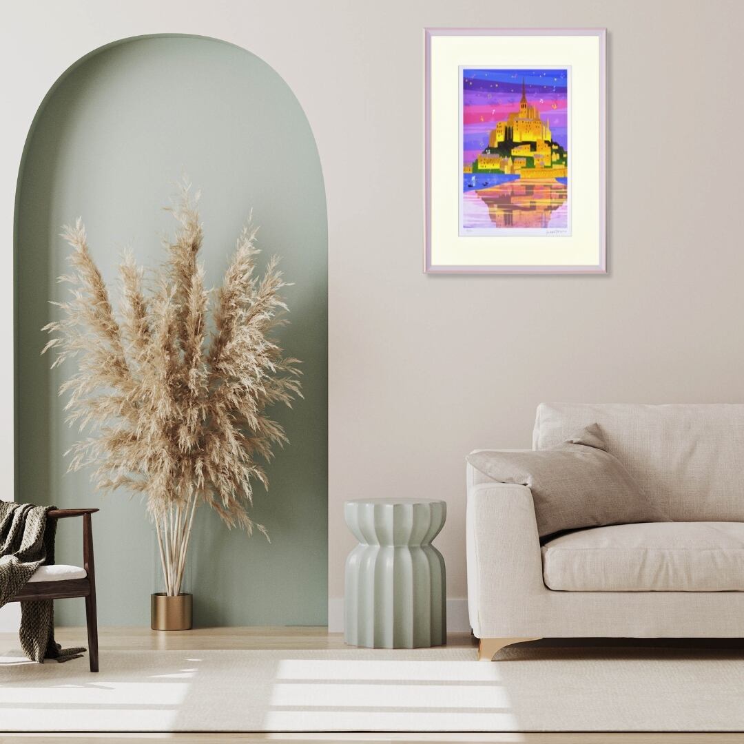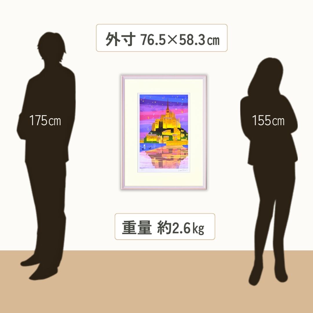 フランスを代表する世界遺産、モンサンミシェルをモチーフに描いたアート作品です。幻想的な夕暮れの空がグラデーションのように広がり、金色に輝く建物が静かに海面に映り込む様子は、まるで夢の中の風景のよう。柔らかな筆致と鮮やかな色彩が織りなす光の表現が印象的で、時間の移ろいとともに変化する美しさを感じさせます。壮大な建築と自然が一体となった構図は、見る人に感動と静寂を届ける芸術的な風景画です。旅情とロマンに満ちたこのアートは、心に残るヨーロッパの名景を鮮やかに描き出しています。