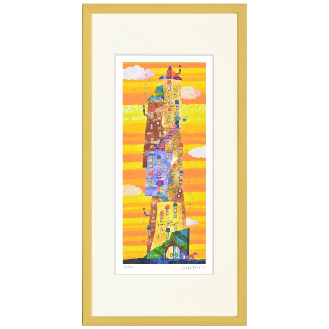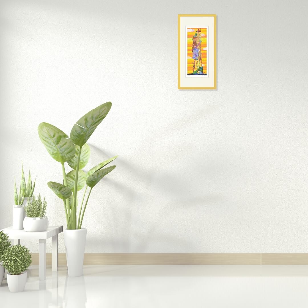 音楽と夢の世界が融合したような幻想的なアート作品「音符塔」。夕暮れを思わせる温かなオレンジとイエローのグラデーションが背景を包み、塔の中から溢れるように舞う音符が見る者の心を弾ませます。塔の窓や階段はリズミカルに配置され、どこか絵本のような温もりを感じさせる構成です。鮮やかな色彩と自由な発想が生み出すこのアートは、音楽の喜びと日常の小さな幸せを象徴しており、眺めるたびに元気と優しさを届けてくれるポップアートの傑作です。