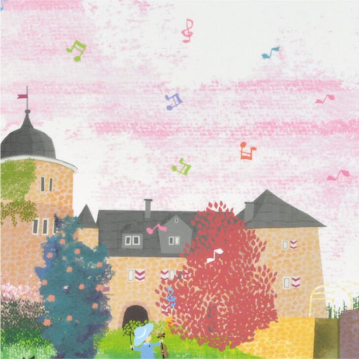 淡いピンク色の空の下、やわらかな光に包まれた古城を描いたアート作品です。春から秋へと季節が移ろうような色合いの木々が城を囲み、赤や黄、緑が優しく溶け合います。画面全体に漂うのは、静かな午後のひとときと、童話の世界のような穏やかな空気。小さな人物と黒猫が添えられ、物語性と温もりを感じさせます。やわらかな筆致と透明感のある色彩が調和した、心を穏やかにする一枚です。。