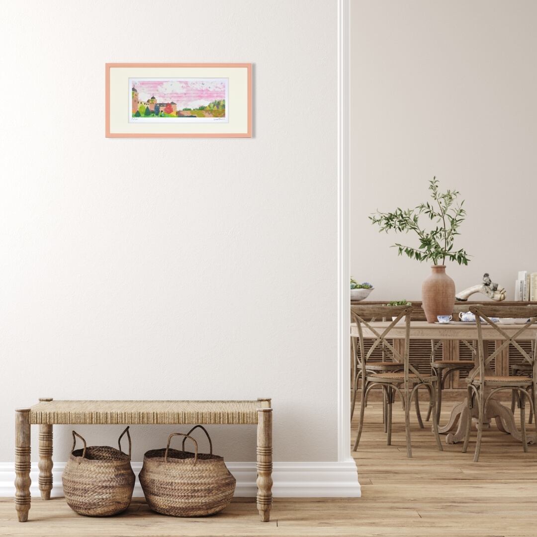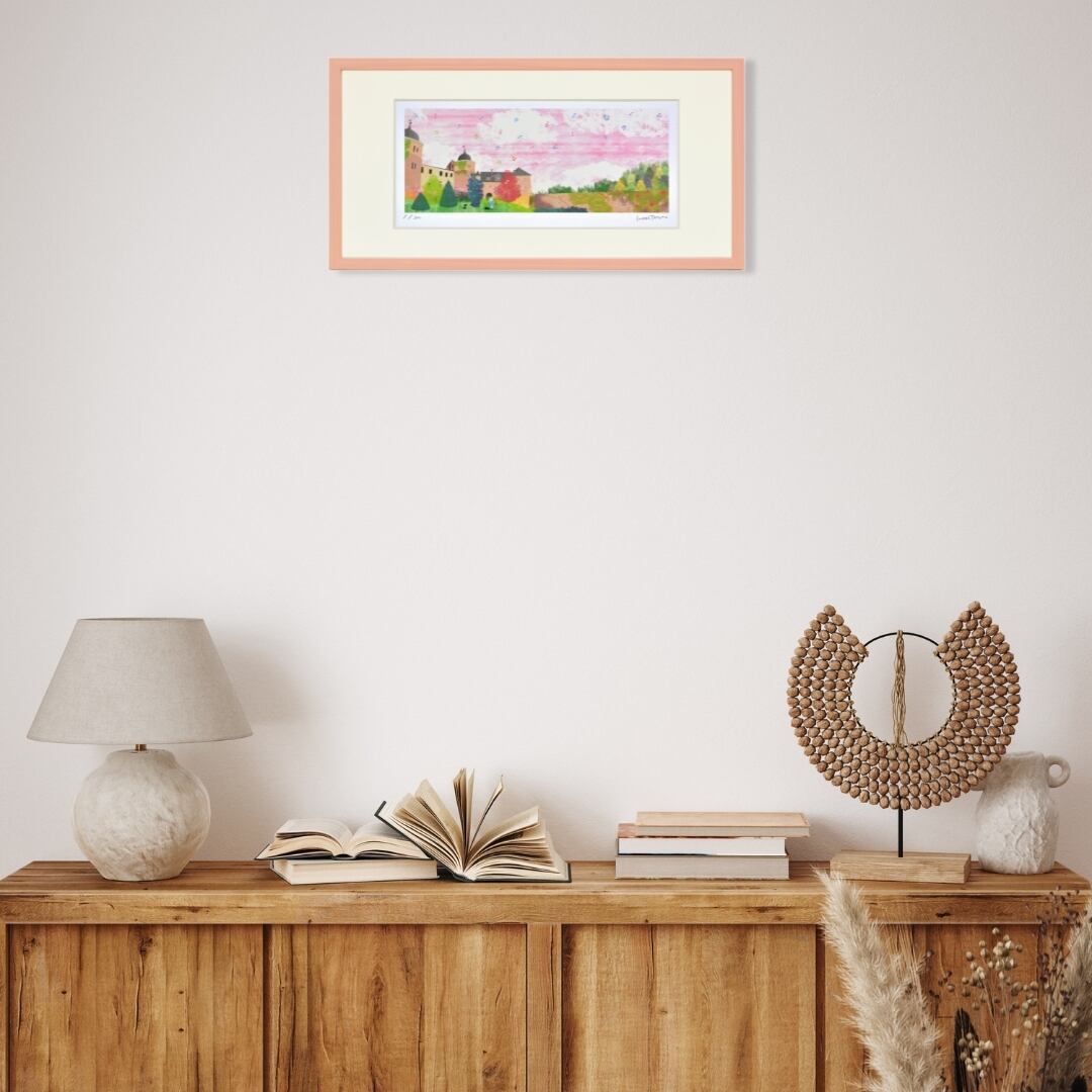 優しいピンク色のフレームが作品の柔らかな印象を引き立て、壁面に温かみを添えます。横長の構図が空間に広がりを生み、リビングや寝室、玄関などにも自然に馴染む上品なデザインです。落ち着いたトーンの中に華やかさもあり、飾るだけで部屋の雰囲気が明るくなります。眺めるたびに心が安らぎ、まるで物語の中に迷い込んだようなやさしい時間を感じさせるアートです。