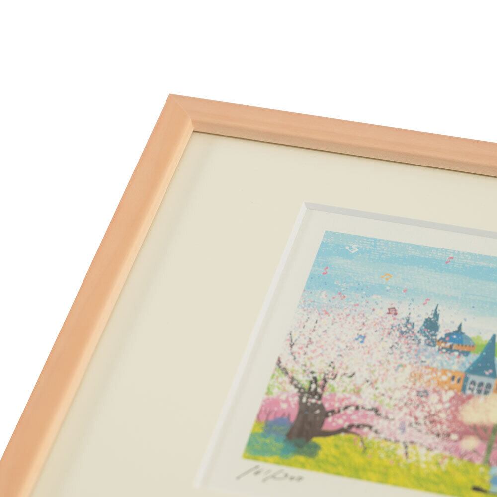 淡いピンク色のフレームが作品の柔らかな色彩と溶け合い、空間に温もりを添えます。横長の構図が壁を広く見せ、リビングや玄関、寝室などに穏やかな季節の息吹を運びます。明るく軽やかな印象ながらも落ち着きがあり、眺めるたびに心がやさしく解けていくようです。日々の中に春の光を感じさせる、美しく心を和ませるアートです。