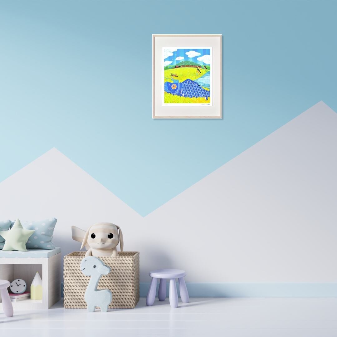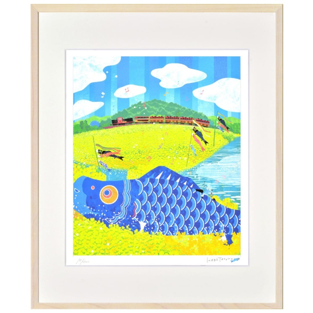 京都・亀岡ののどかな田園風景を舞台に、菜の花の黄色が一面に広がる中を、青空に向かって鯉のぼりが泳ぐ光景を描いた作品です。柔らかな春風が吹き抜け、空には軽やかな雲が流れ、遠くには赤い列車が走り抜けます。大きな青い鯉のぼりが手前に横たわる構図は、子どもの成長を願う温かな気持ちを象徴しており、春の日の喜びと希望に満ちた情景が広がります。見ているだけで胸の奥に爽やかな風が吹くような、心弾む一枚です。