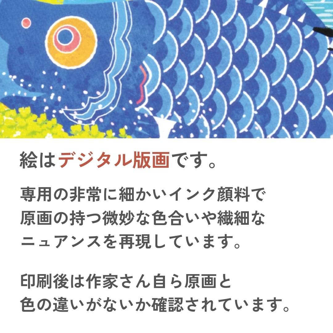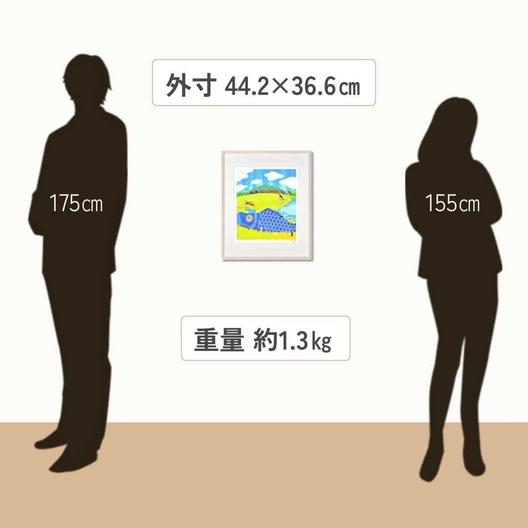 やわらかな白木のフレームが、春の光のような明るさを引き立てます。菜の花の黄色と空の青が空間を晴れやかに彩り、玄関やリビングなどに飾ると、毎日に温もりと元気を運び込みます。こどもの日の季節にはもちろん、春の訪れを感じさせるインテリアとしてもおすすめです。伸びやかに泳ぐ鯉のぼりの姿が、見る人の心に前向きなエネルギーを与えてくれる、幸福感あふれる作品です。