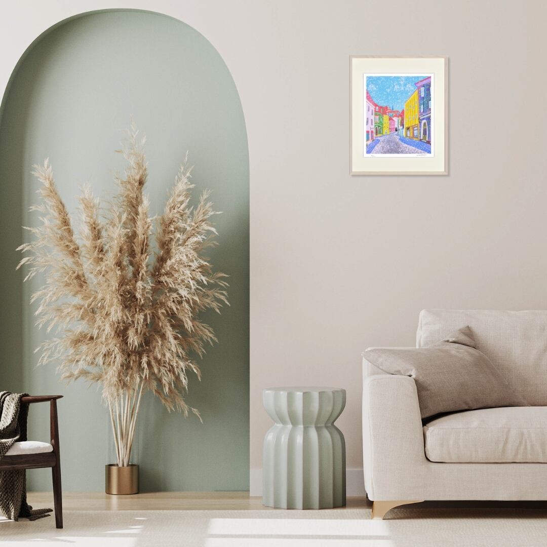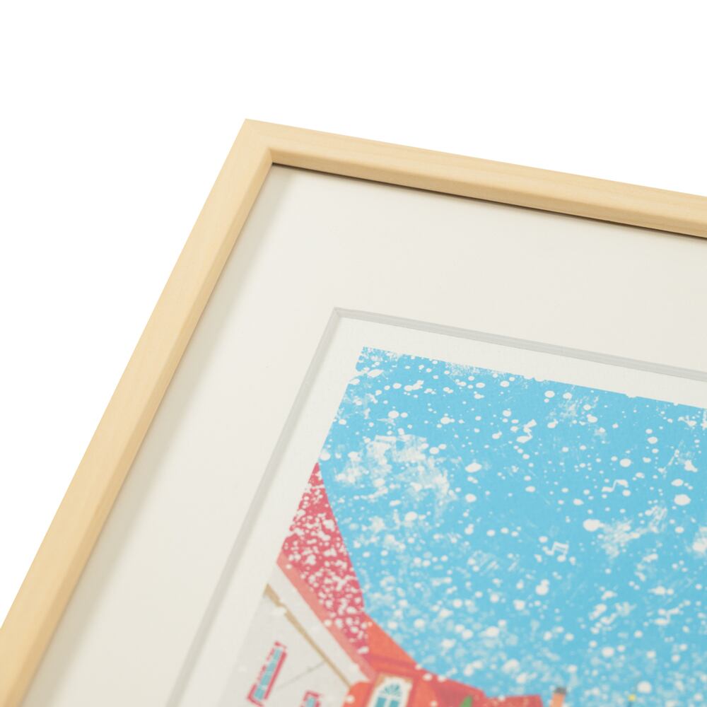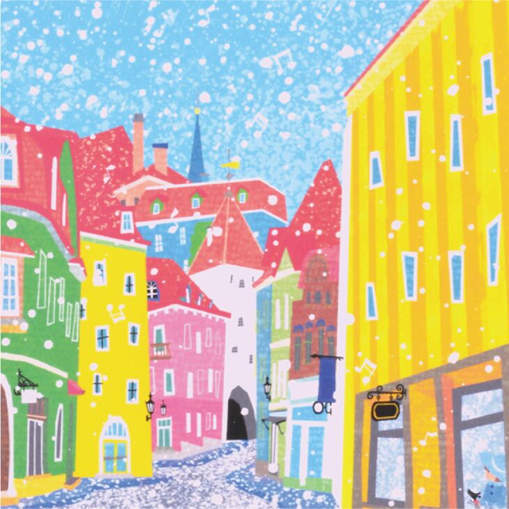 この作品を飾ると、静けさと華やかさが同居するような不思議な空気が生まれます。冬の冷たい空気を思わせる青や白のトーンが、空間を清らかに引き締めながら、家々の色彩がやわらかな明るさを添えます。見るたびに、雪の舞う音まで感じられるような静寂が広がり、穏やかな気持ちへと導いてくれるでしょう。季節の情景を楽しみながら、心を落ち着かせるひとときを運ぶ作品です。
