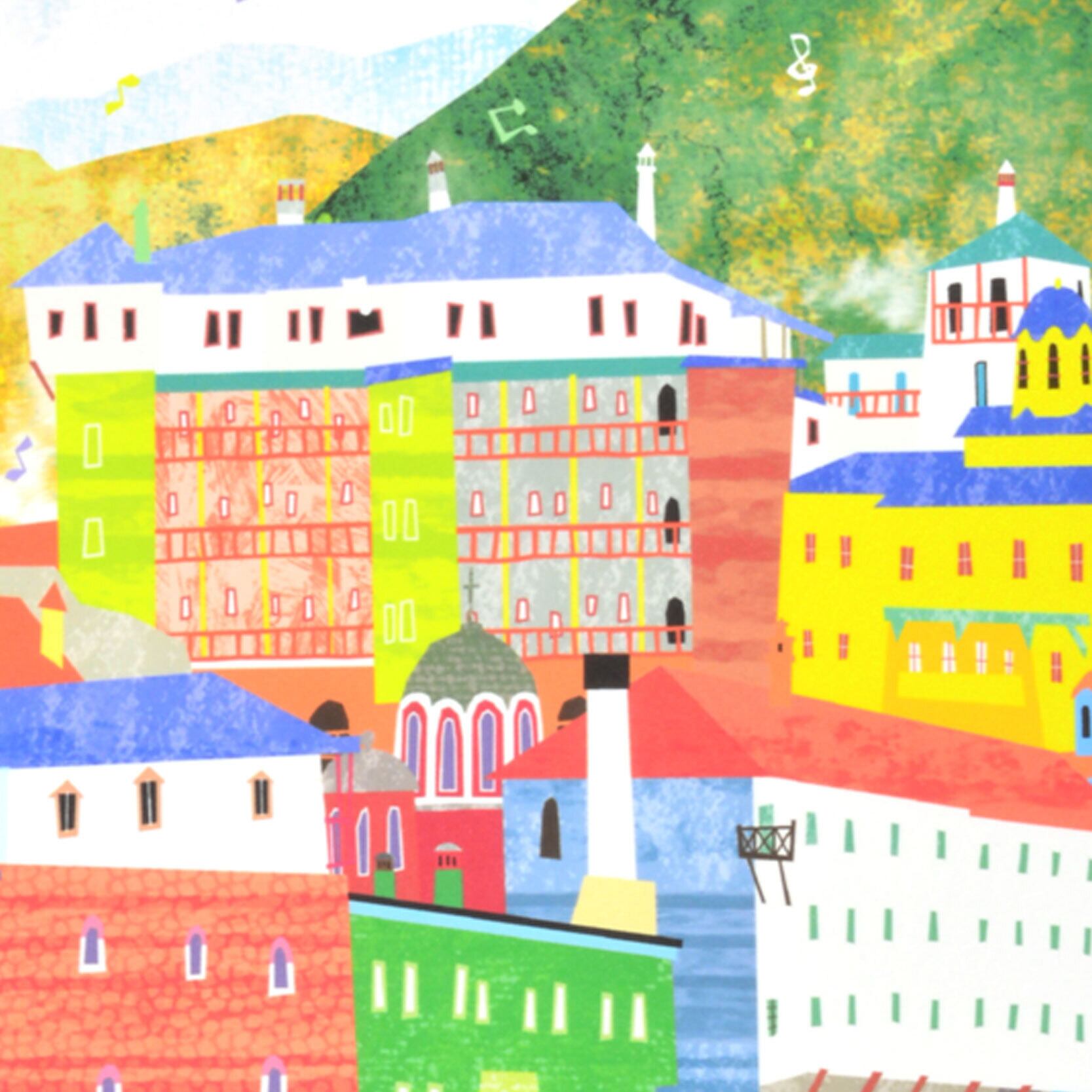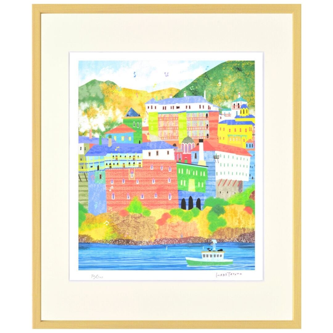 エーゲ海を臨むギリシャの修道院、オシウ・グリゴリウ。陽光に包まれたカラフルな建物が、海と山の間に寄り添うように並びます。白い雲がゆるやかに流れ、波間には小舟が静かに浮かんでいます。青い海、赤や黄の家並み、緑豊かな丘が響き合い、まるで音楽のように調和する景色です。古い歴史を感じさせながらも、どこか明るく軽やかで、心が旅に出たような解放感を味わえる作品です。