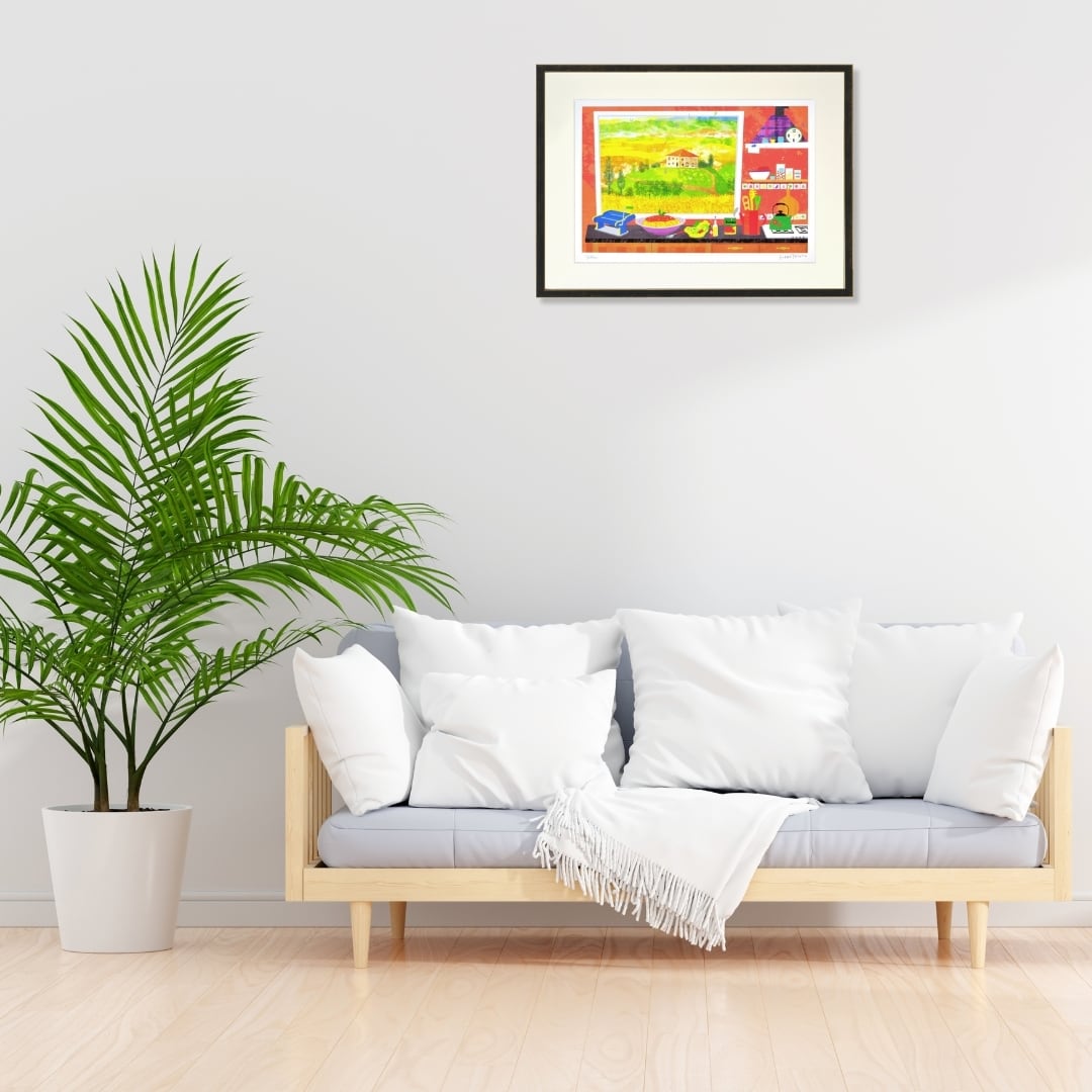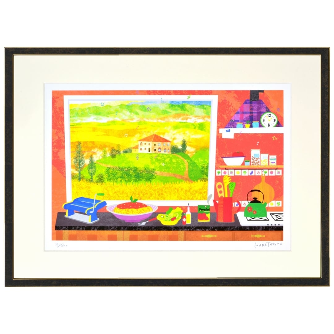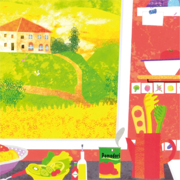 窓の外には黄金色に染まる丘陵地。トスカーナを思わせる穏やかな風景が広がり、陽光が畑をやさしく包みます。手前のキッチンでは、彩り豊かな食材が並び、トマトソースの香りが漂うようです。イタリアの人々が大切にする「食と暮らしの喜び」が、明るくのびやかな色彩で描かれています。外の自然と内の生活がひとつにつながる、豊かで幸福な時間が感じられる作品です。